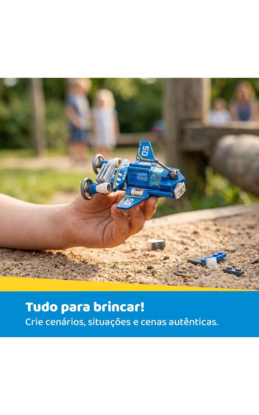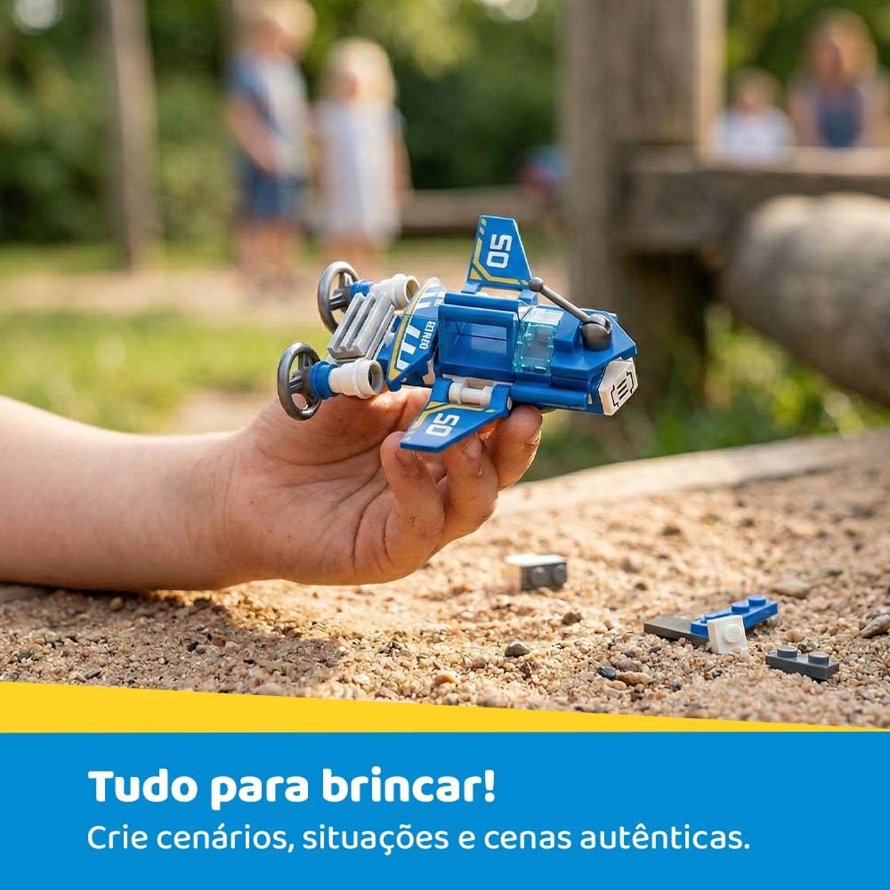 Diversas peças para montar os diferentes cenários e auxiliar o desenvolvimento da imaginação, coordenação motora, concentração e novos desafios.