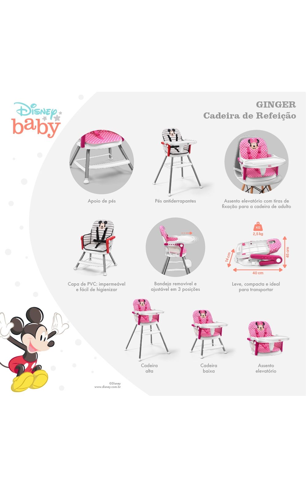Mais do que apenas uma cadeira, a Ginger oferece um excepcional custo-benefício. Esta cadeira multifuncional pode ser usada como cadeira alta para bebês de até 15 kg e como cadeira portátil para crianças de até 25 kg.