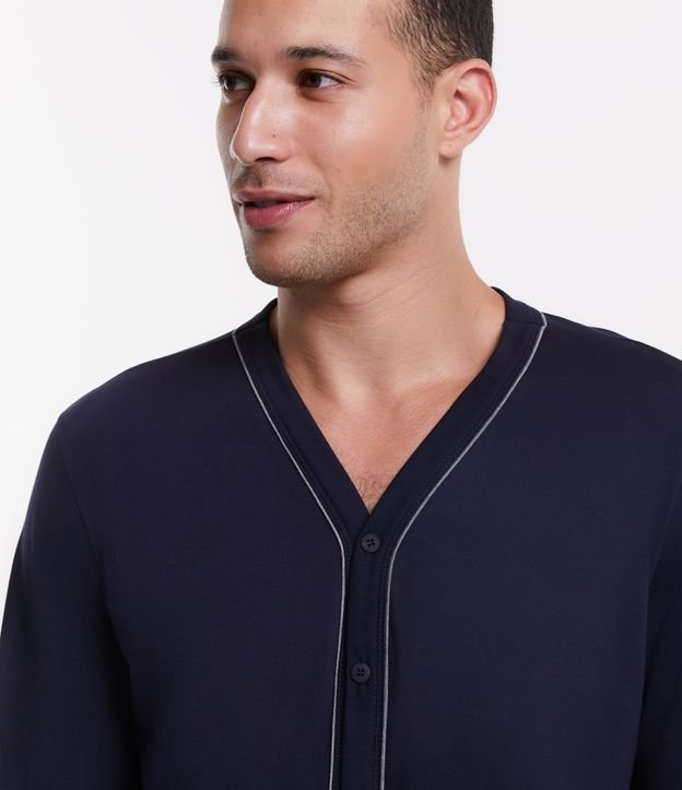 Conjunto de pijama alongado confeccionado em meia malha com camisa de mangas longas com listras contrastantes no abotoamento frontal e calça com elástico no cós.