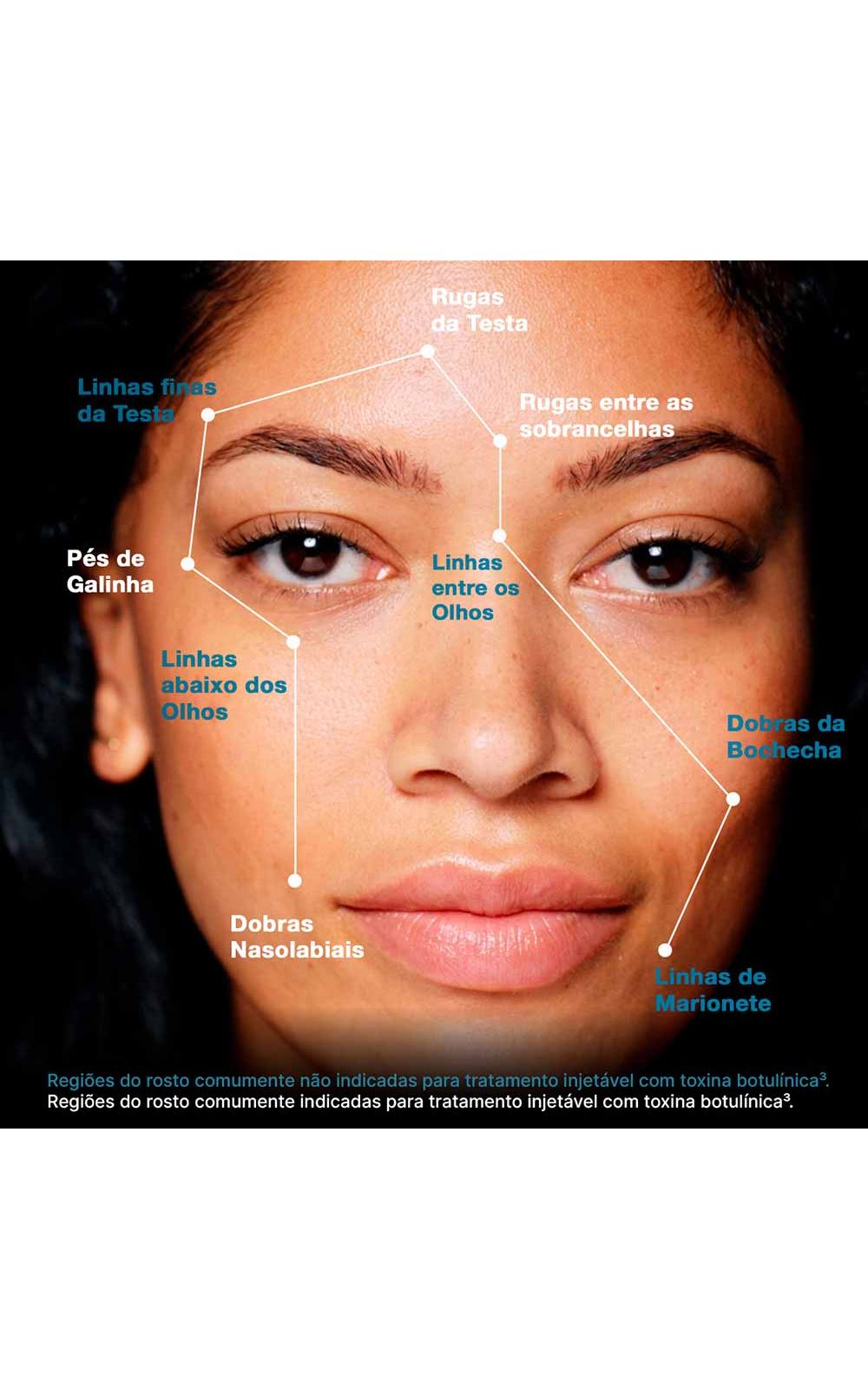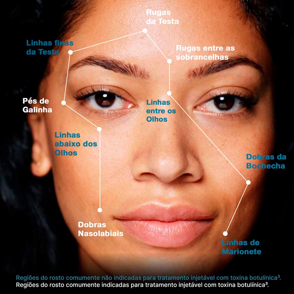 Linhas Finas da Testa, Rugas da Testa, Pés de Galinha, Linhas entre os Olhos, Linhas abaixo dos Olhos, Linhas entre as Sobrancelhas, Linhas de Marionete, Dobras da Bochecha, Dobras Nasolabiais.