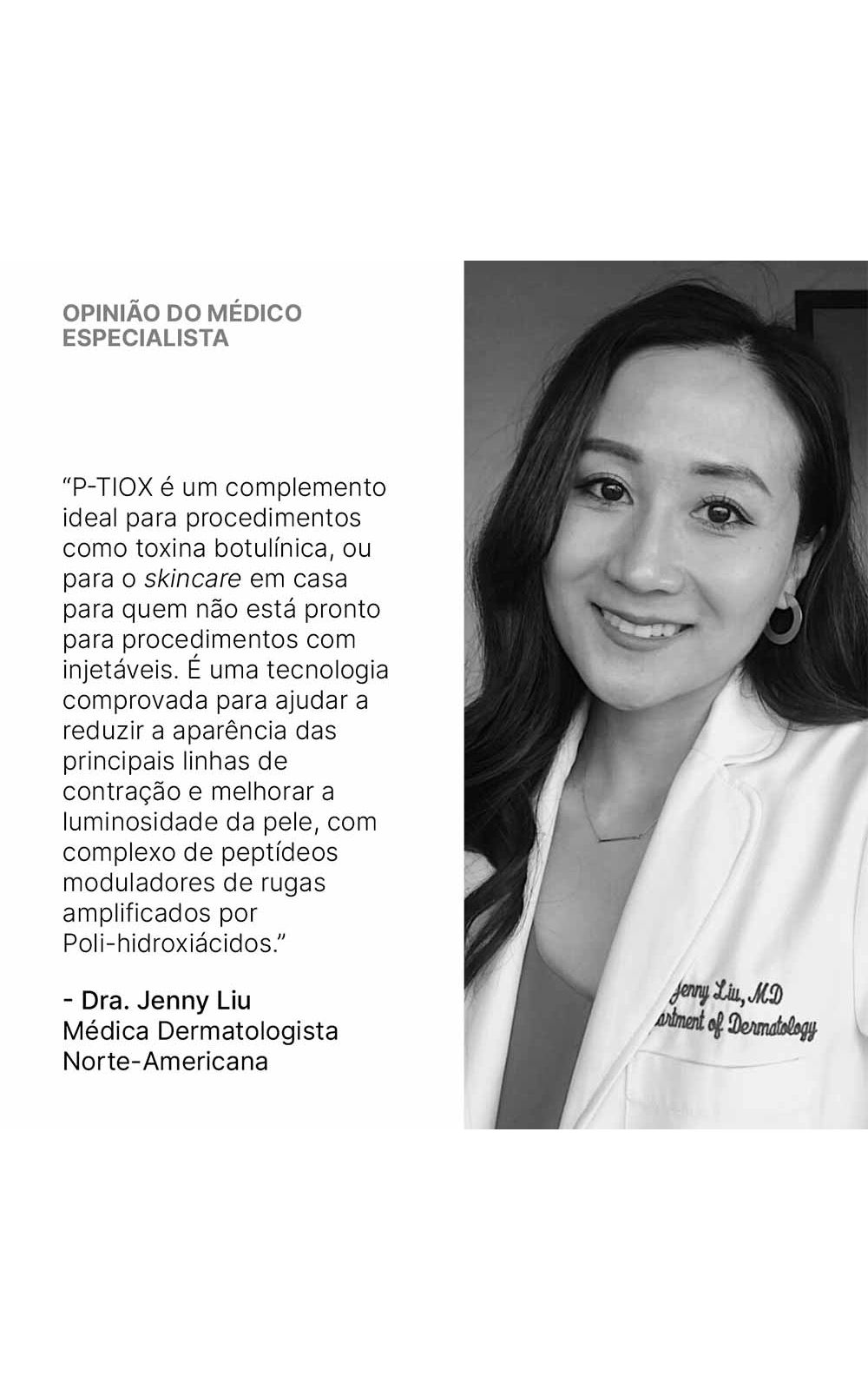 O P-TIOX é uma NOVA TECNOLOGIA¹, formulado com Complexo Avançado de Neuropeptídeos que corrige Rugas de Contração (Rugas Dinâmicas ou Linhas de Expressão) causadas pelas expressões faciais repetitivas, inclusive em regiões não indicadas para tratamento injetável com toxina botulínica. Além disso, é amplificado pelo Glass Skin Blend: 5% PHA, 5% Niacinamida e Extrato de Laminaria, para melhorar a textura da pele e luminosidade.