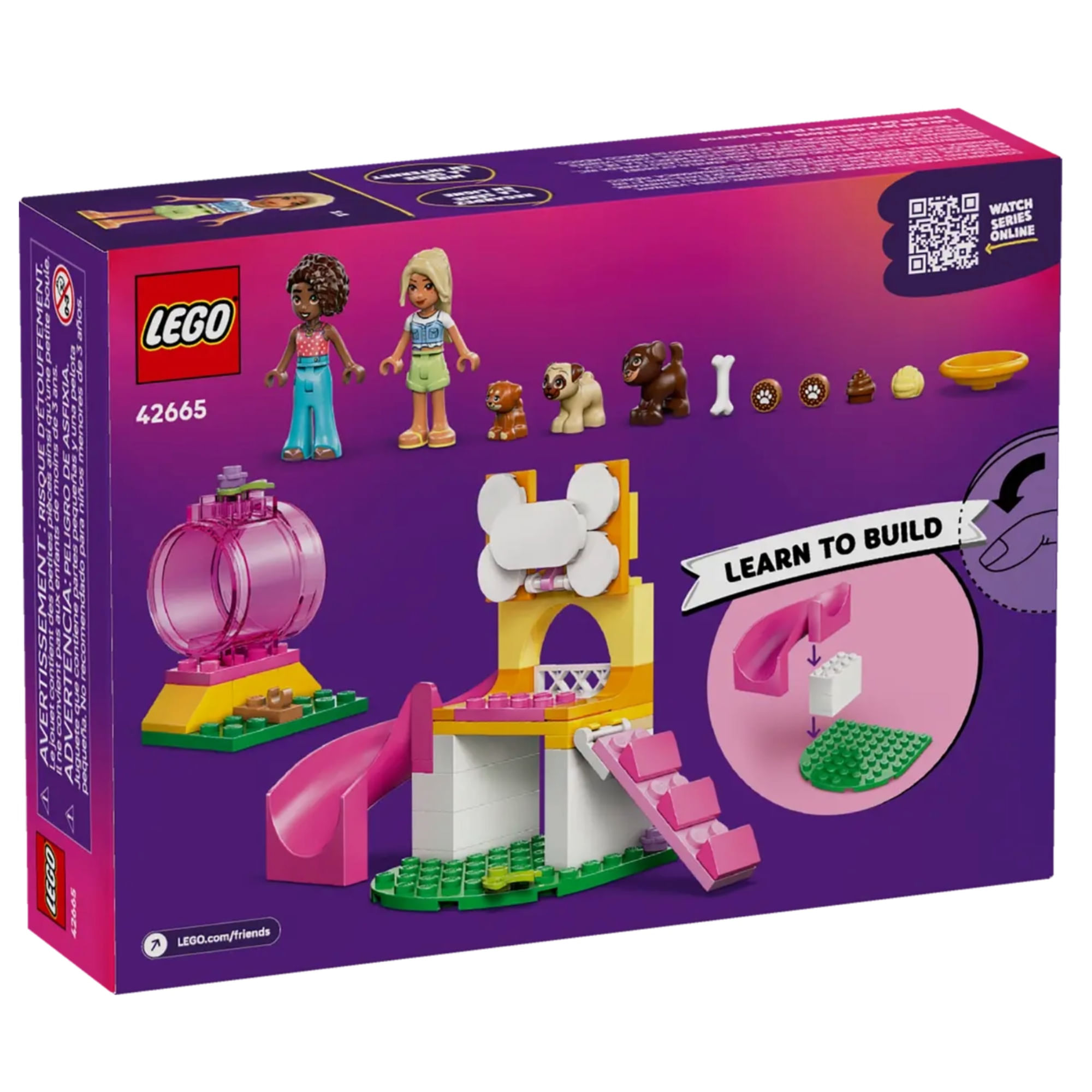 Cod LEGO: 42665Descrição Comercial: Este kit de construção infantil incrível combina a fofura dos filhotes com brincadeira de faz de conta para encantar meninas e meninos a partir de 4 anos. Os pequenos amantes de animais podem construir o Playground para Filhotes LEGO® Friends (42665) e se divertir criando histórias de amizade com os personagens. O conjunto inclui as minibonecas Aliya e Sara, 3 bonecos de cachorro e muitos acessórios para brincadeiras imaginativas.Este conjunto de animais inspira as crianças a brincar com os personagens enquanto os amigos ajudam os cachorrinhos fofos a descer pelo escorregador, subir a escada e correr pelo tubo. O conjunto é um ótimo presente para quem ama cachorros e inclui acessórios divertidos, como uma bola, biscoitos e um osso, além de um cocô de cachorro para mais risadas!Os brinquedos LEGO 4+ para crianças em idade pré-escolar vêm com elementos úteis de início rápido peças maiores que ajudam as crianças a começar sua aventura de construção. Proporcione ao seu filho uma aventura de construção fácil e intuitiva com o aplicativo LEGO Builder. Aqui, eles podem ampliar e girar modelos em 3D, salvar conjuntos e acompanhar seu progresso.Kit de construção repleto de poder de cachorrinho Este LEGO® Friends Puppy Playground infantil para meninas e meninos a partir de 4 anos inclui um playground montável, 2 minibonecas, 3 bonecos de cachorro e acessóriosUm brinquedo de dramatização para amantes de animais Este brinquedo pré-escolar inclui muitos recursos para alimentar a imaginação das crianças enquanto elas exploram o escorregador, a escada e o tubo com os 3 cachorrinhos.2 minibonecas LEGO® Friends e 3 bonecos de cachorro Este conjunto vem com minibonecas Aliya e Sara, além dos filhotes Aira, Dango e Maple para que as crianças possam explorar situações sociais e criar histórias de amizade.Acessórios de brinquedo para cachorro Este conjunto de brincadeira de faz de conta vem com acessórios divertidos para brincadeiras imaginativas, incluindo uma bola, biscoitos para cachorro e um osso, além de um elemento de cocô de cachorro para fazer as crianças riremUm presente para amantes de cães Este conjunto de brinquedos é um ótimo presente para meninas, meninos e fãs de filhotes com 4 anos ou mais, e estimula as habilidades sociais das crianças enquanto elas criam histórias para os personagensShow online Inspire mais ideias de brincadeiras criativas com outros conjuntos (vendidos separadamente) e o show online LEGO® Friends: The Next Chapter, onde as crianças podem conhecer os personagens de Heartlake CityVamos contar uma história de amizade A linha de conjuntos de construção LEGO® Friends permite que as crianças explorem diferentes momentos de amizade, com muitas oportunidades de criar suas próprias histórias imaginativasMedidas conjunto de 66 peças com um modelo principal medindo mais de 3,5 pol. (9 cm) de altura, 5,5 pol. (14 cm) de largura e 2,5 pol. (6 cm) de profundidadeIdade: 4 anos ou maisIdade Mínima: 4Interesses: AnimaisLimite de venda: 2Número de peças: 66Peças: 1 - 99Recomendações (pdp): ATENÇÃO! NÃO RECOMENDÁVEL PARA CRIANÇAS MENORES DE 3 (TRES) ANOS POR CONTER PARTE(S) PEQUENA(S) QUE PODE(M) SER ENGOLIDA(S) OU ASPIRADA(S) E BOLINHAS QUE PODEM APRESENTAR PERIGO DE ASFIXIA. NÃO APROPRIADO PARA MENORES DE 3 ANOS. Nº de Registro: 005828/2021naorecomendado_3anos: SimqtdVendasPorCliente: 2
