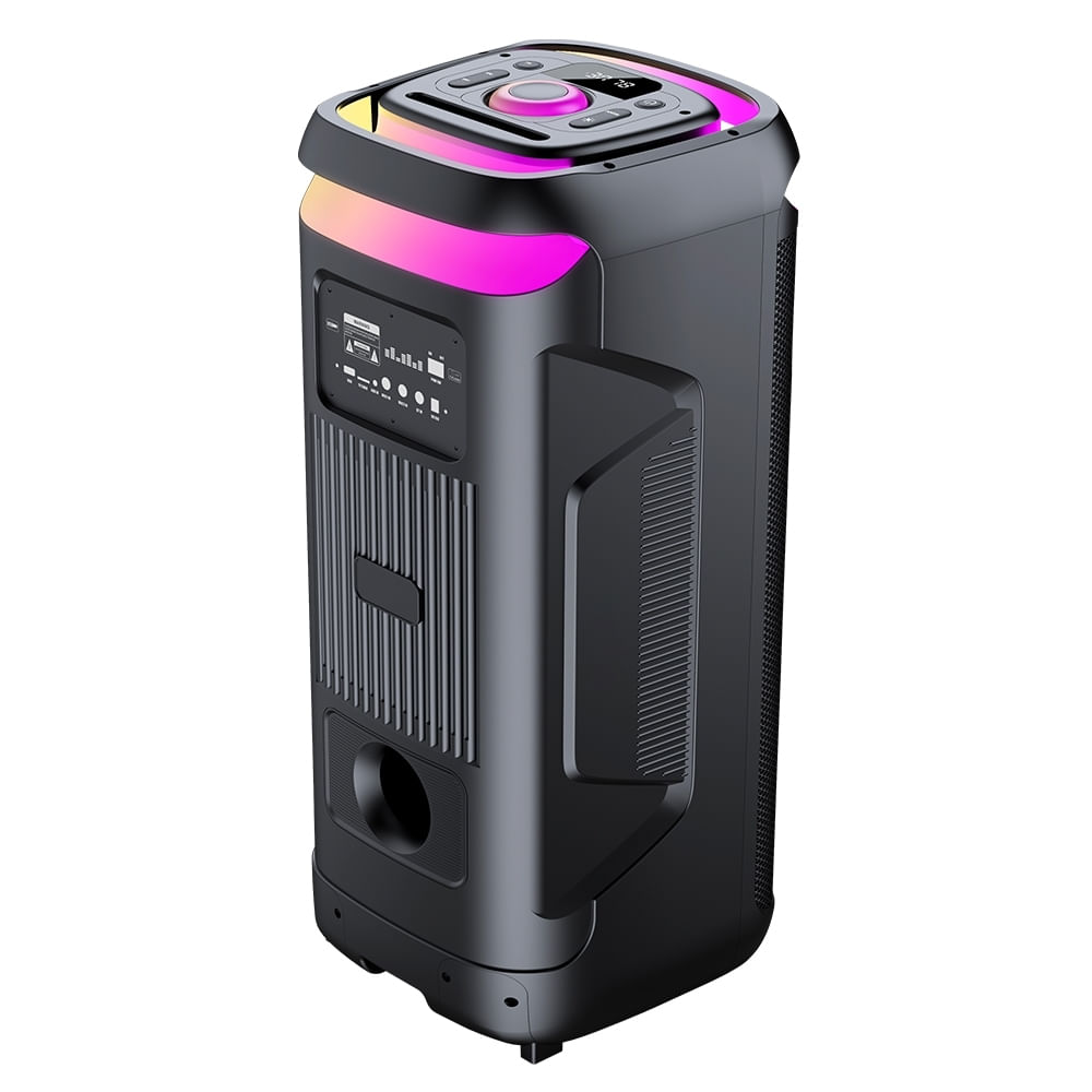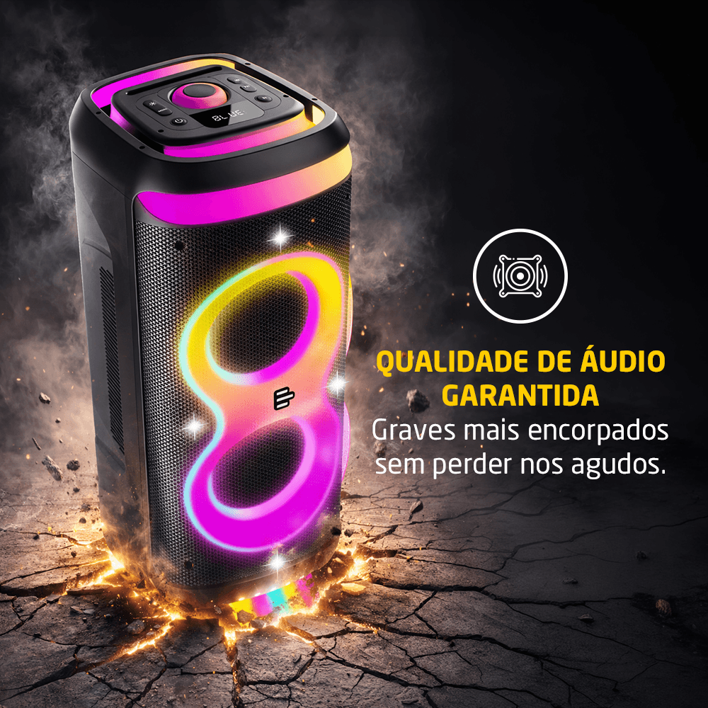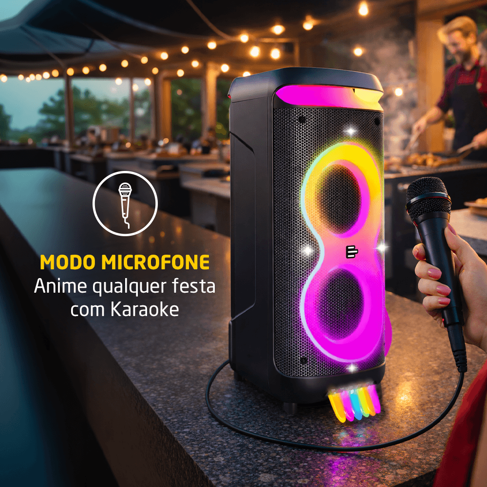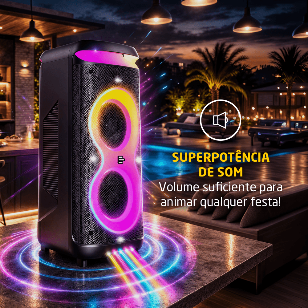 Seu sistema de som é composto por dois drivers de 8 polegadas e dois drivers de 3 polegadas, garantindo um áudio bem distribuído, com graves potentes e agudos nítidos. A potência de 1400W RMS assegura que o som seja reproduzido com fidelidade, mantendo a clareza e a força necessárias para diferentes tipos de ambiente.