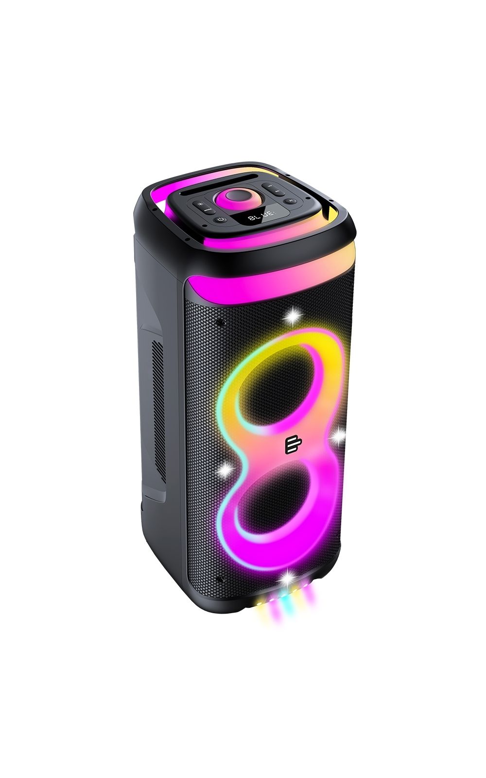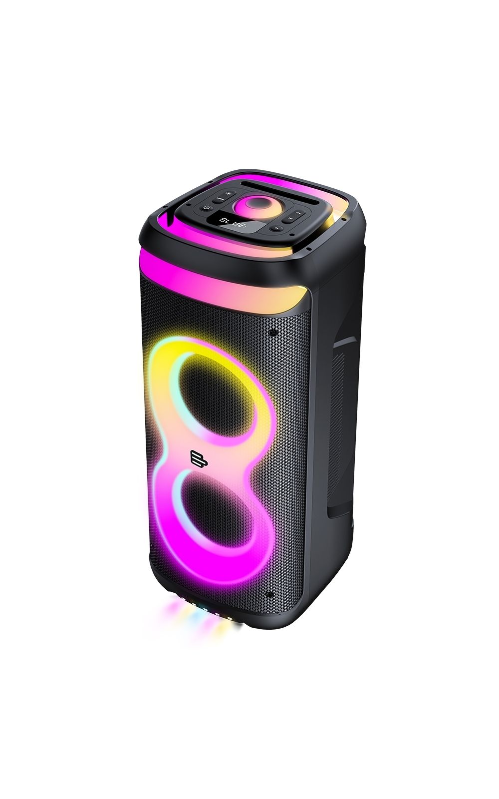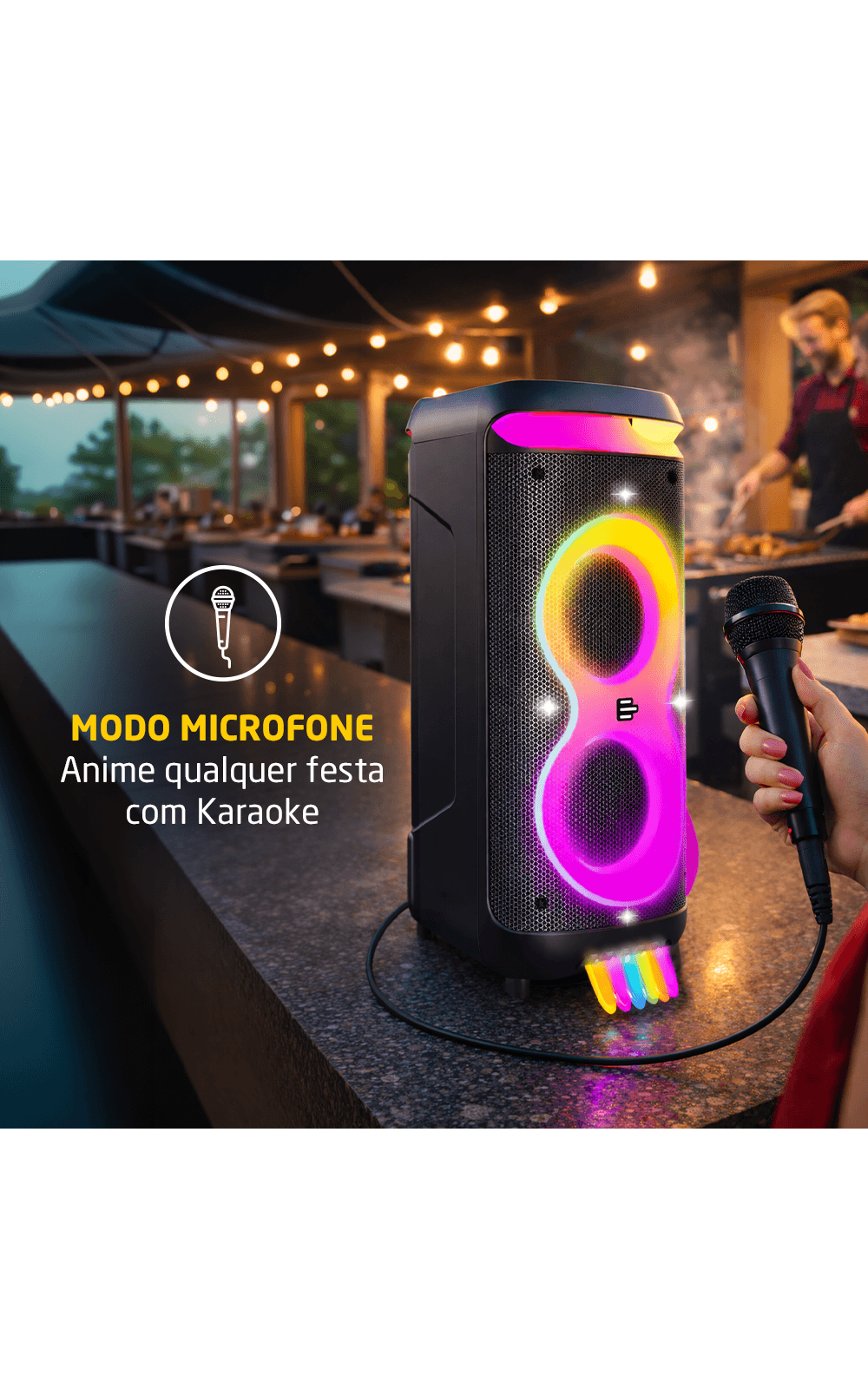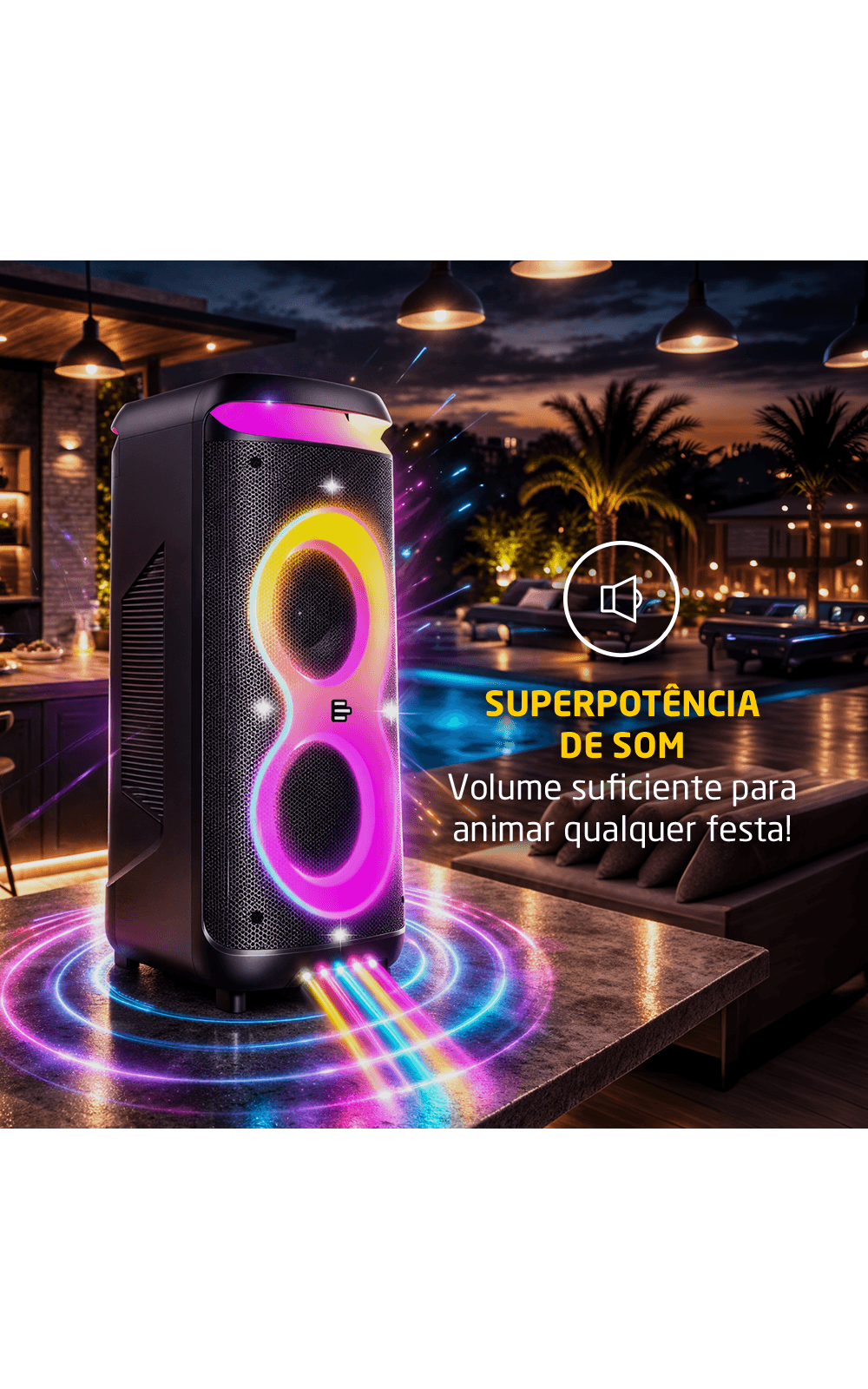 Seu sistema de som é composto por dois drivers de 8 polegadas e dois drivers de 3 polegadas, garantindo um áudio bem distribuído, com graves potentes e agudos nítidos. A potência de 1400W RMS assegura que o som seja reproduzido com fidelidade, mantendo a clareza e a força necessárias para diferentes tipos de ambiente.