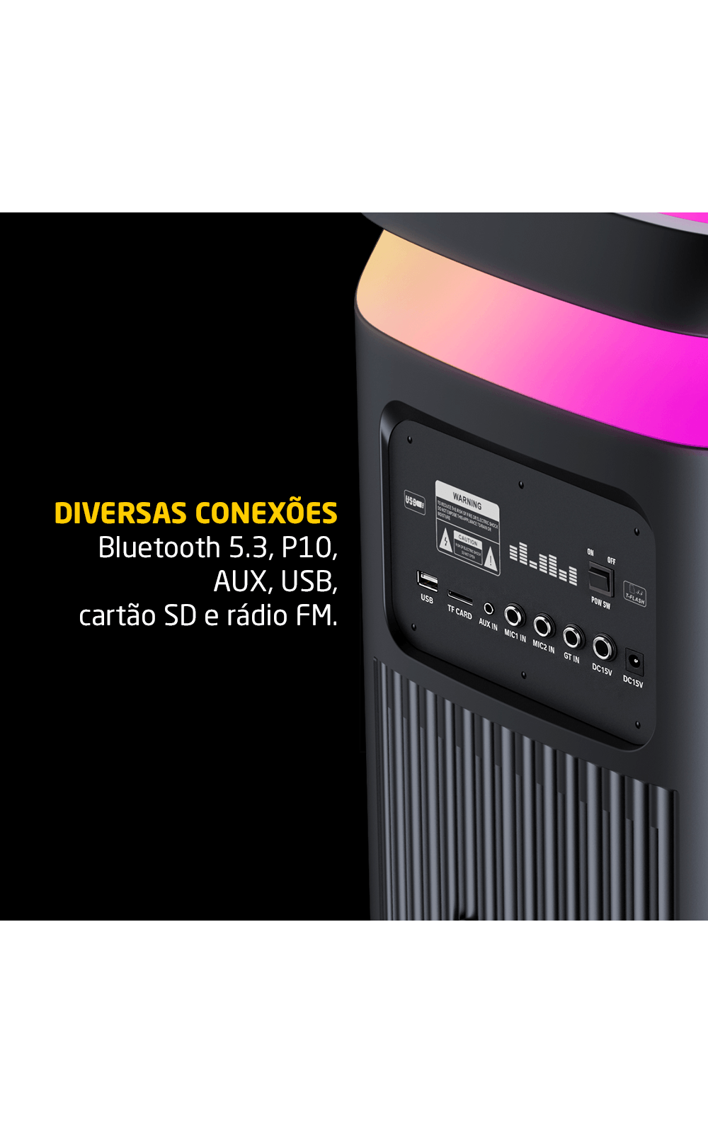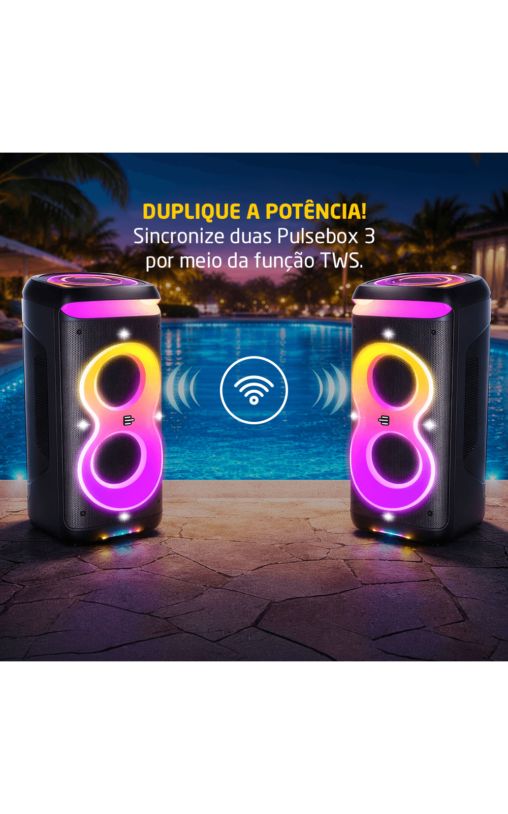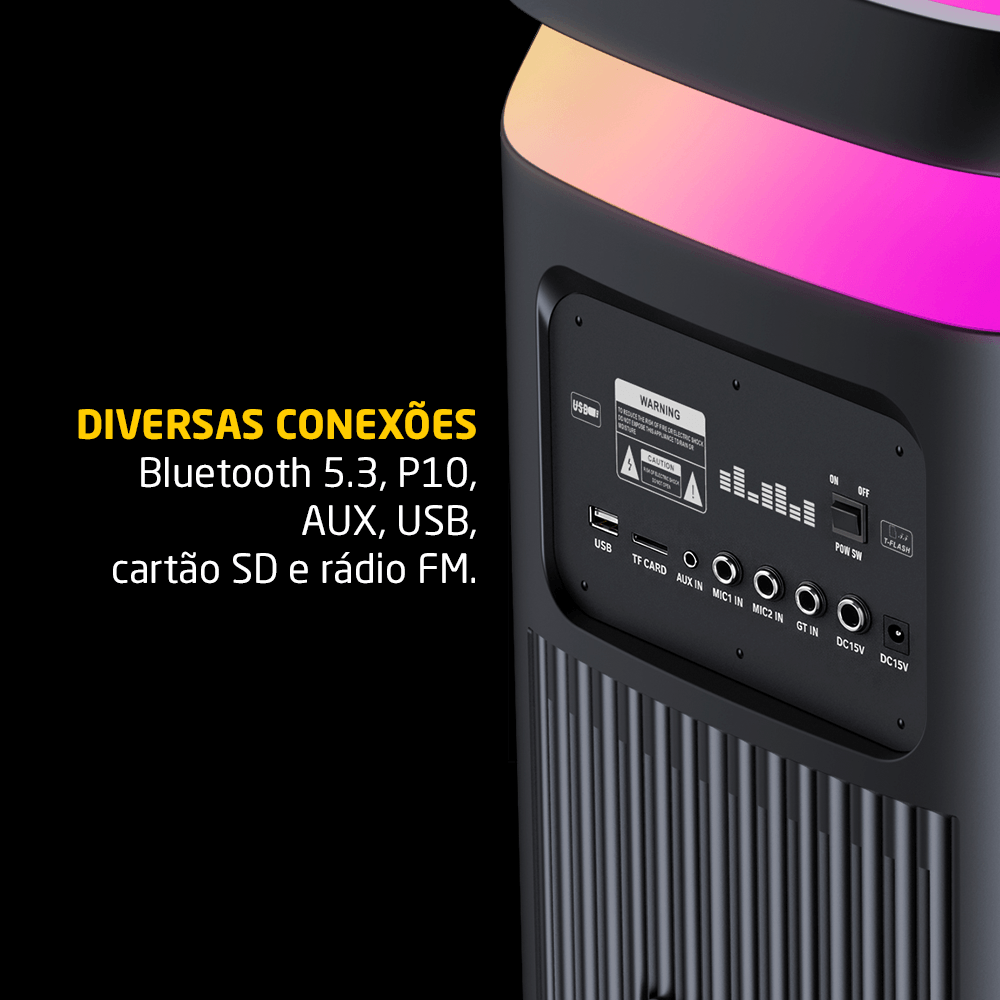 Além da qualidade sonora, a PULSEBOX 3 DOUBLE 8 se destaca pela ampla conectividade. Conta com Bluetooth 5.3, permitindo uma conexão estável e rápida com dispositivos móveis como smartphones, tablets e notebooks. Também possui entrada P10, ideal para microfones e instrumentos musicais, além de entrada auxiliar e rádio FM. O recurso TWS (True Wireless Stereo) possibilita a conexão sem fio entre duas unidades da mesma linha para um efeito estéreo mais envolvente.