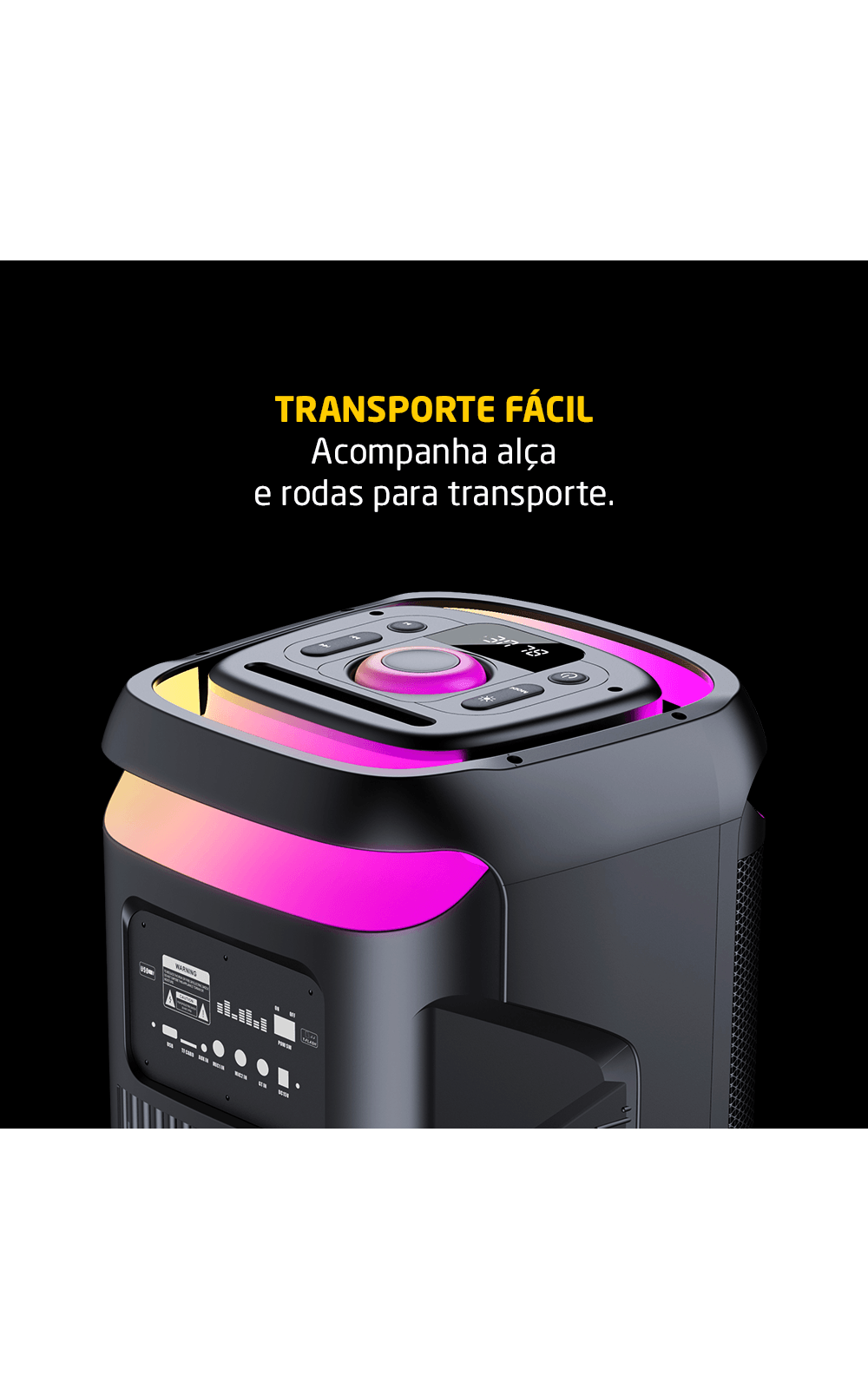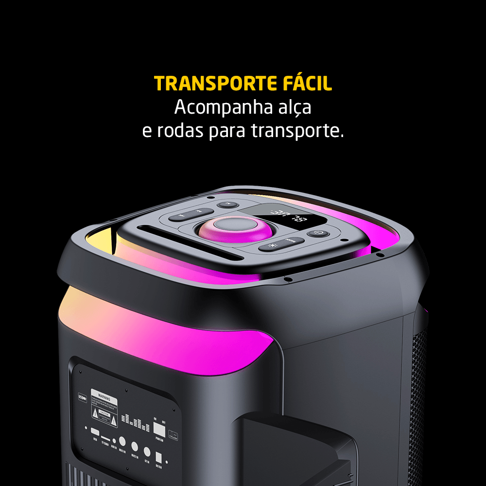 O design foi pensado para facilitar a mobilidade e o transporte do equipamento. A caixa possui uma alça resistente, tornando seu deslocamento mais prático. Seu acabamento robusto garante durabilidade e proteção para uso contínuo em diferentes ambientes.
