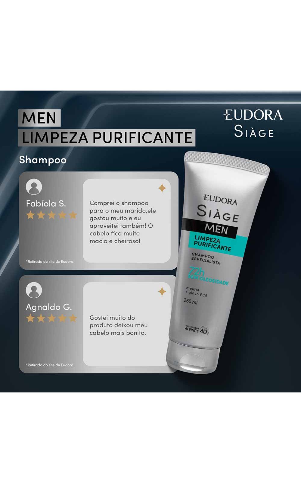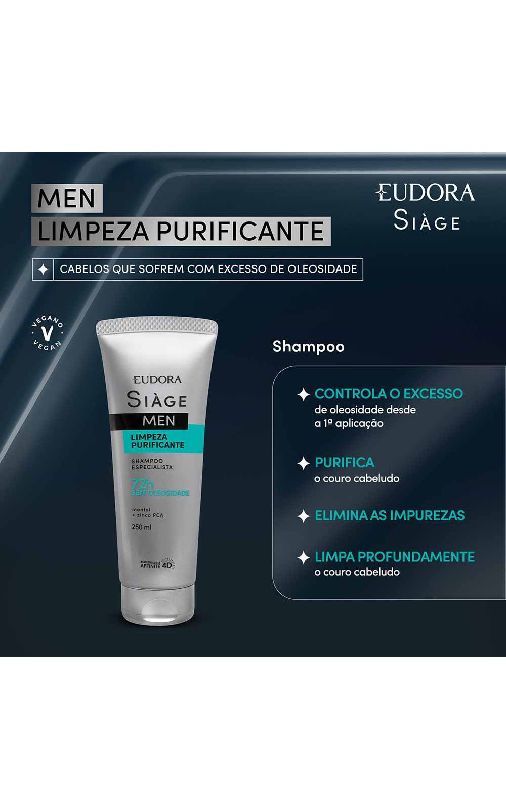 O Shampoo Siàge Men Limpeza Purificante é um produto revolucionário da linha Eudora Siàge Men, especialmente desenvolvido para atender às necessidades específicas do cabelo masculino. Com uma formulação Clean Beauty e Vegan, este shampoo atua diretamente na limpeza profunda do couro cabeludo, eliminando as impurezas e proporcionando uma sensação de frescor e pureza desde a primeira aplicação.