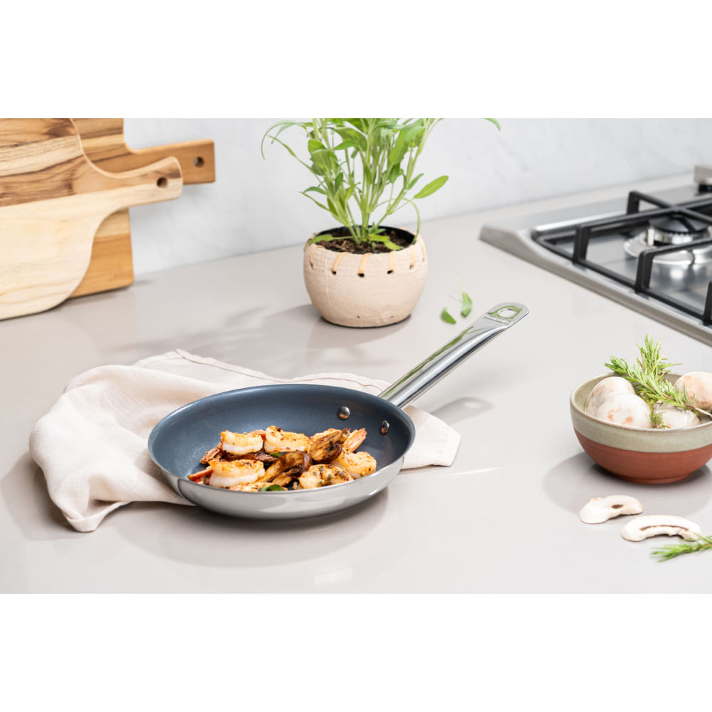 A Frigideira Rasa Tramontina Professional em Aço Inox com Fundo Triplo e Revestimento Interno Cerâmico Grafite de 20 cm e 1,1 L é a escolha ideal para quem busca excelência e eficiência no preparo de alim