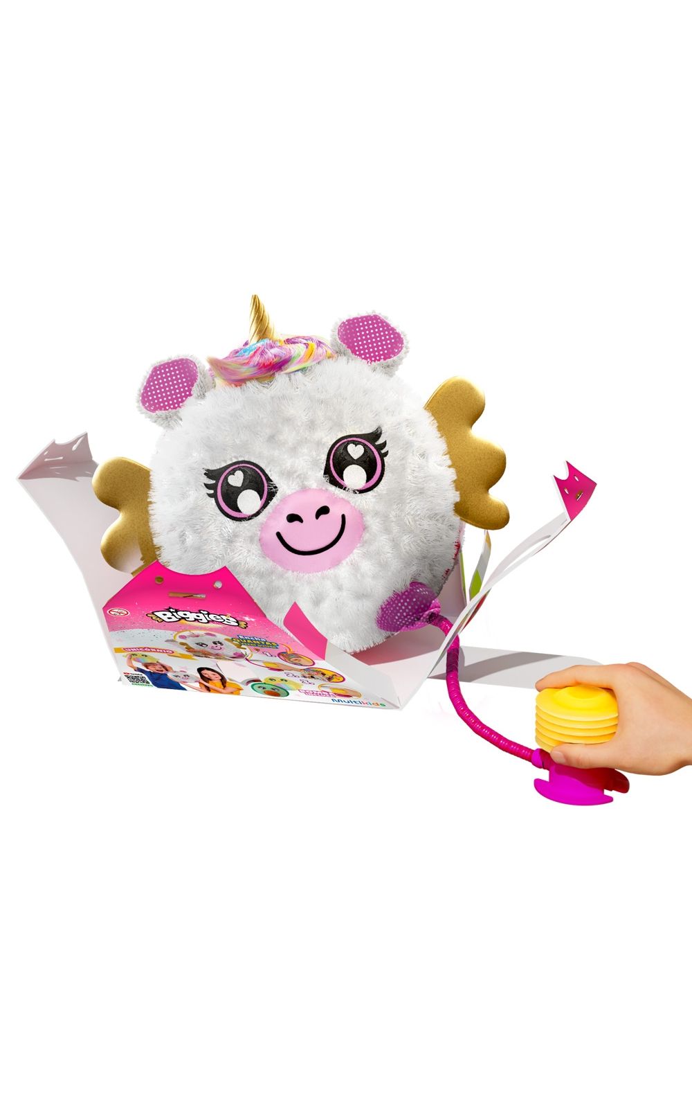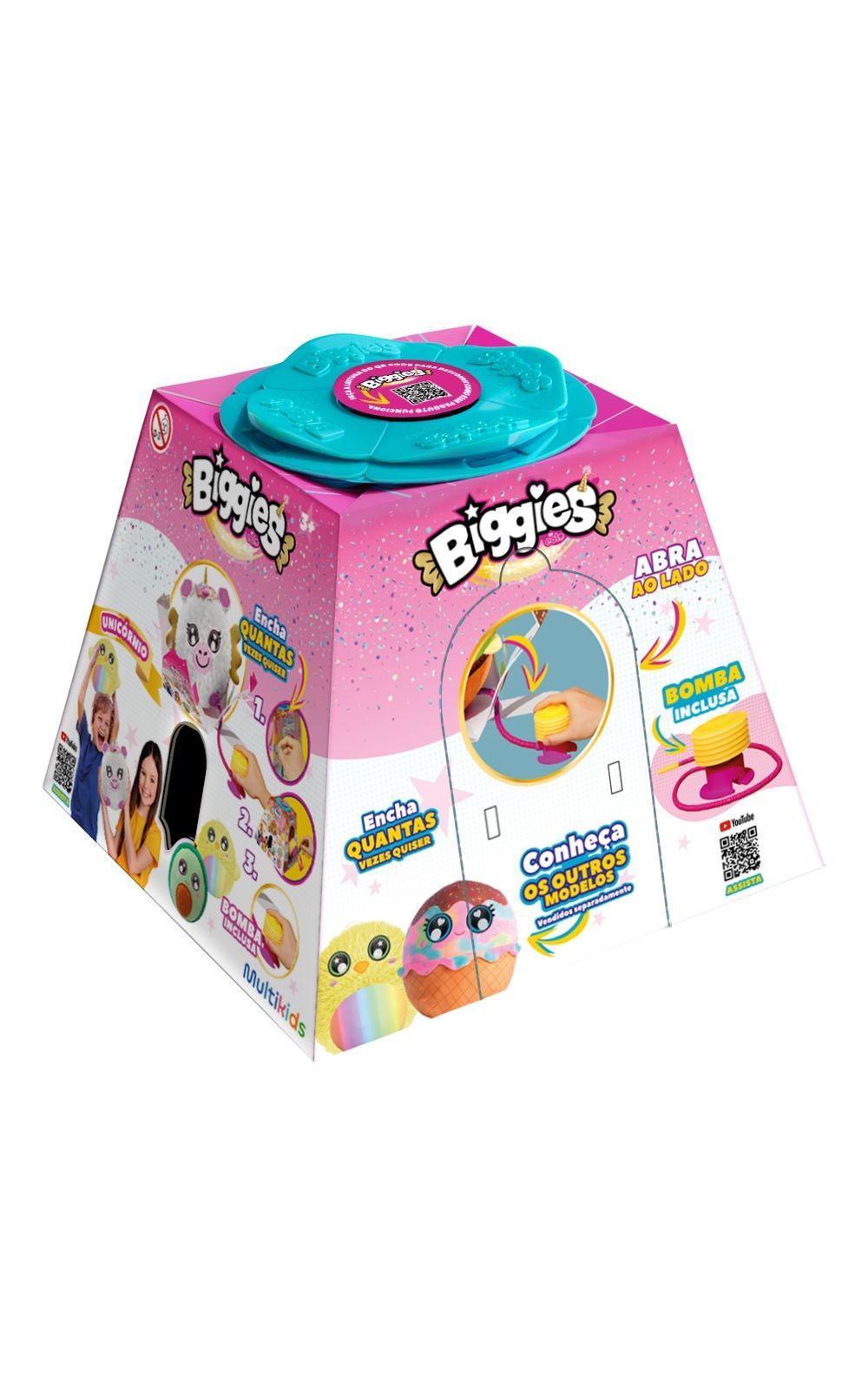 Conheça os Biggies! São quatro bichinhos de pelúcia superfofinhos que você vai adorar colecionar*. Cada um vem em uma caixa misteriosa. Você só precisa remover o adesivo, começar a bombear e, de repente, a pelúcia vai crescer bem na sua frente, ficando cada vez m