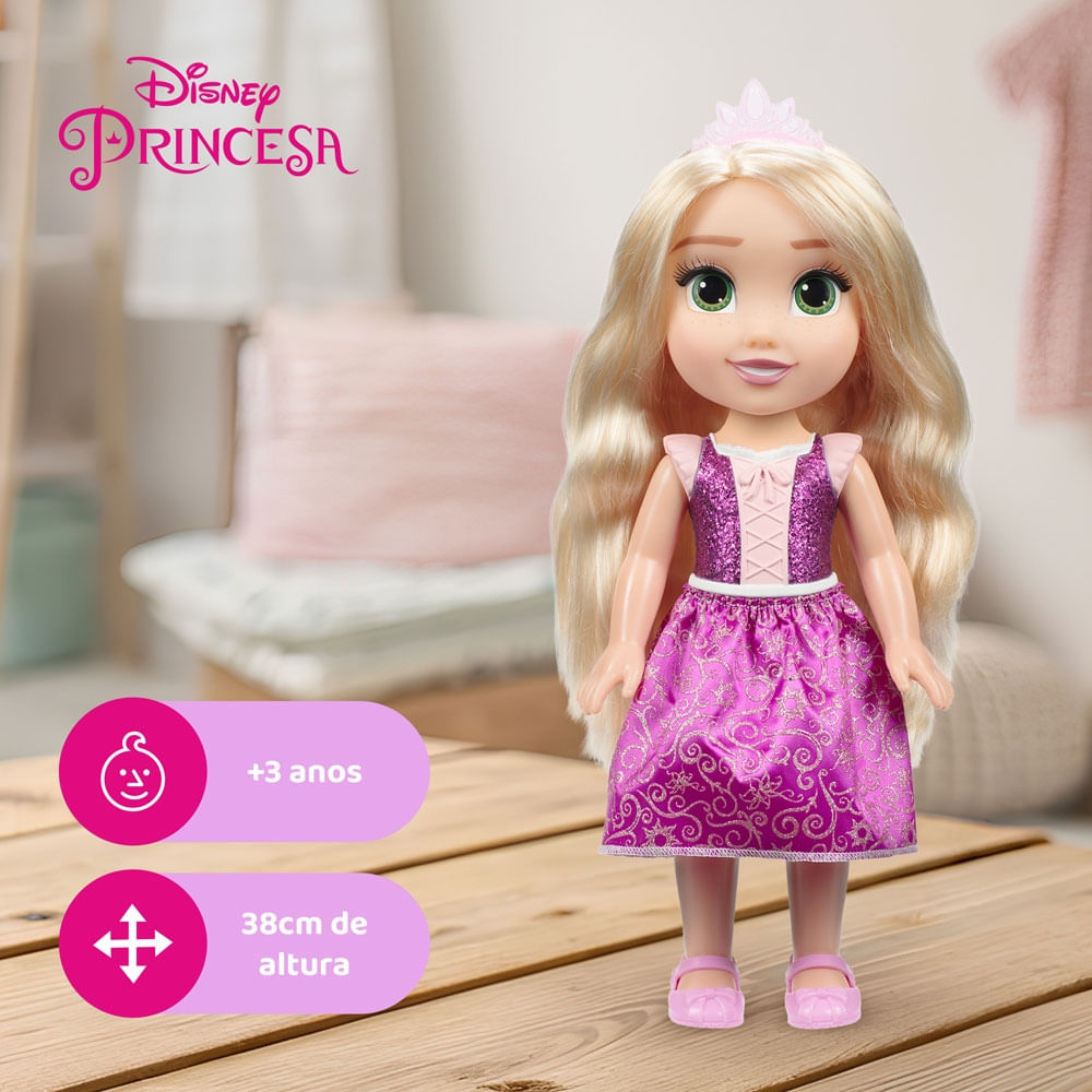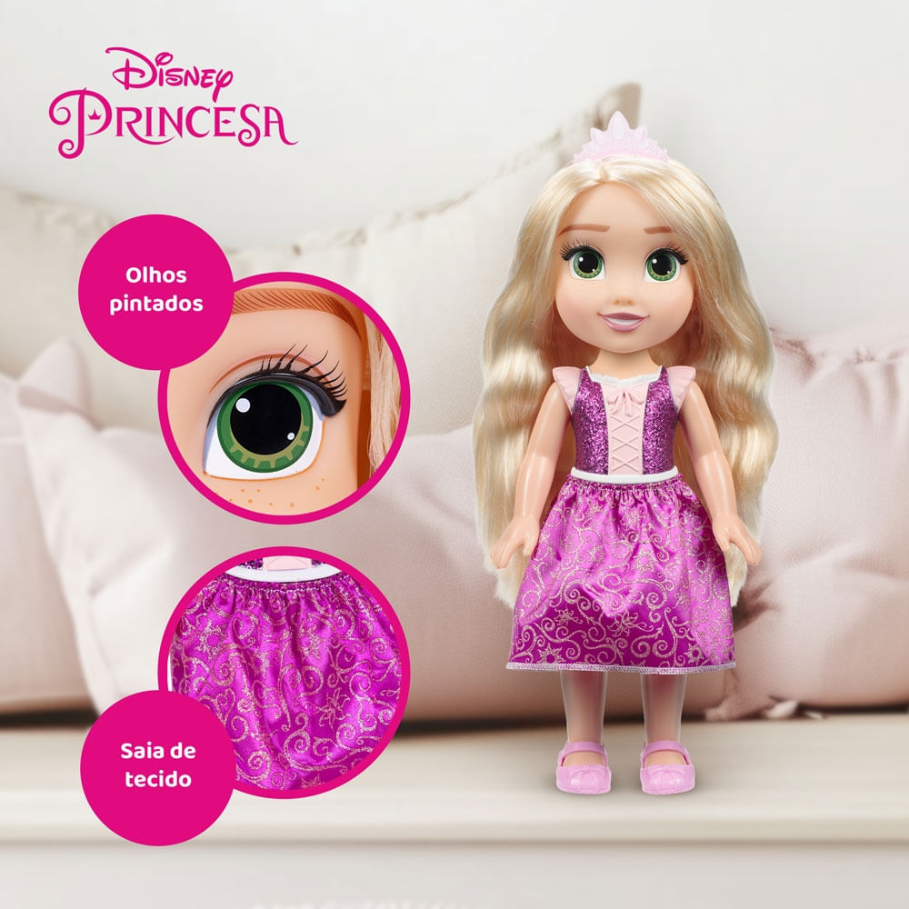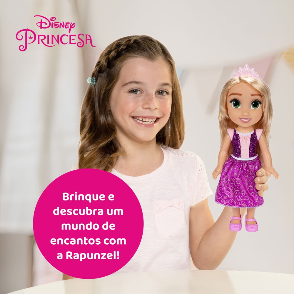 Junte-se a uma jornada mágica de aventuras e sonhos com a belíssima Boneca Disney Princesa Rapunzel!