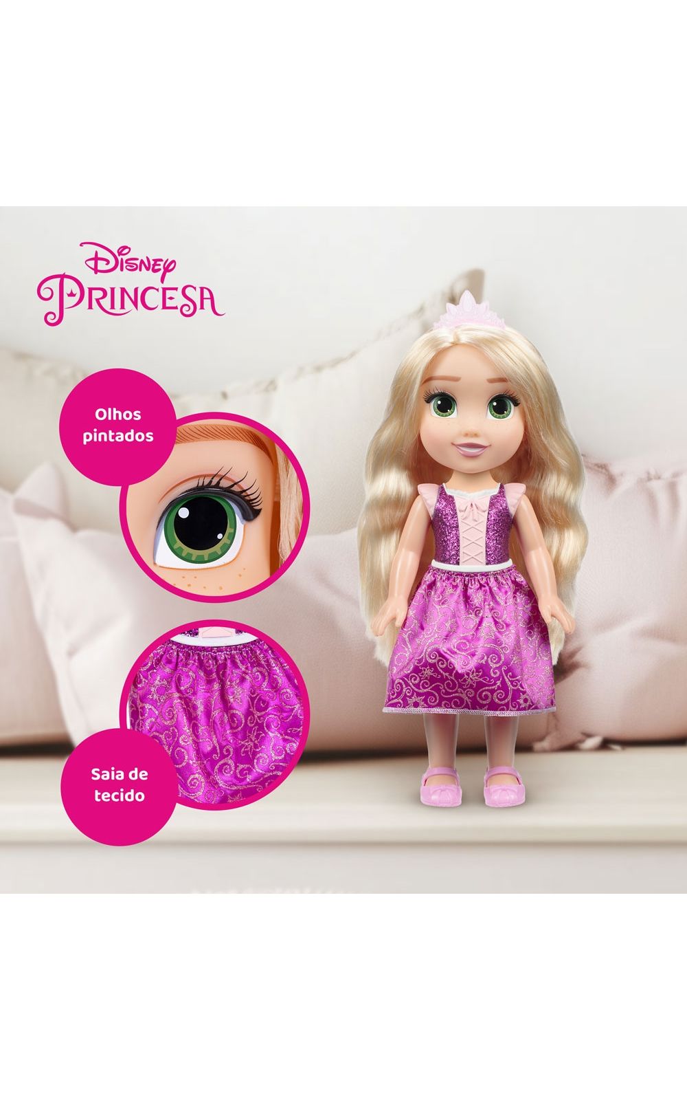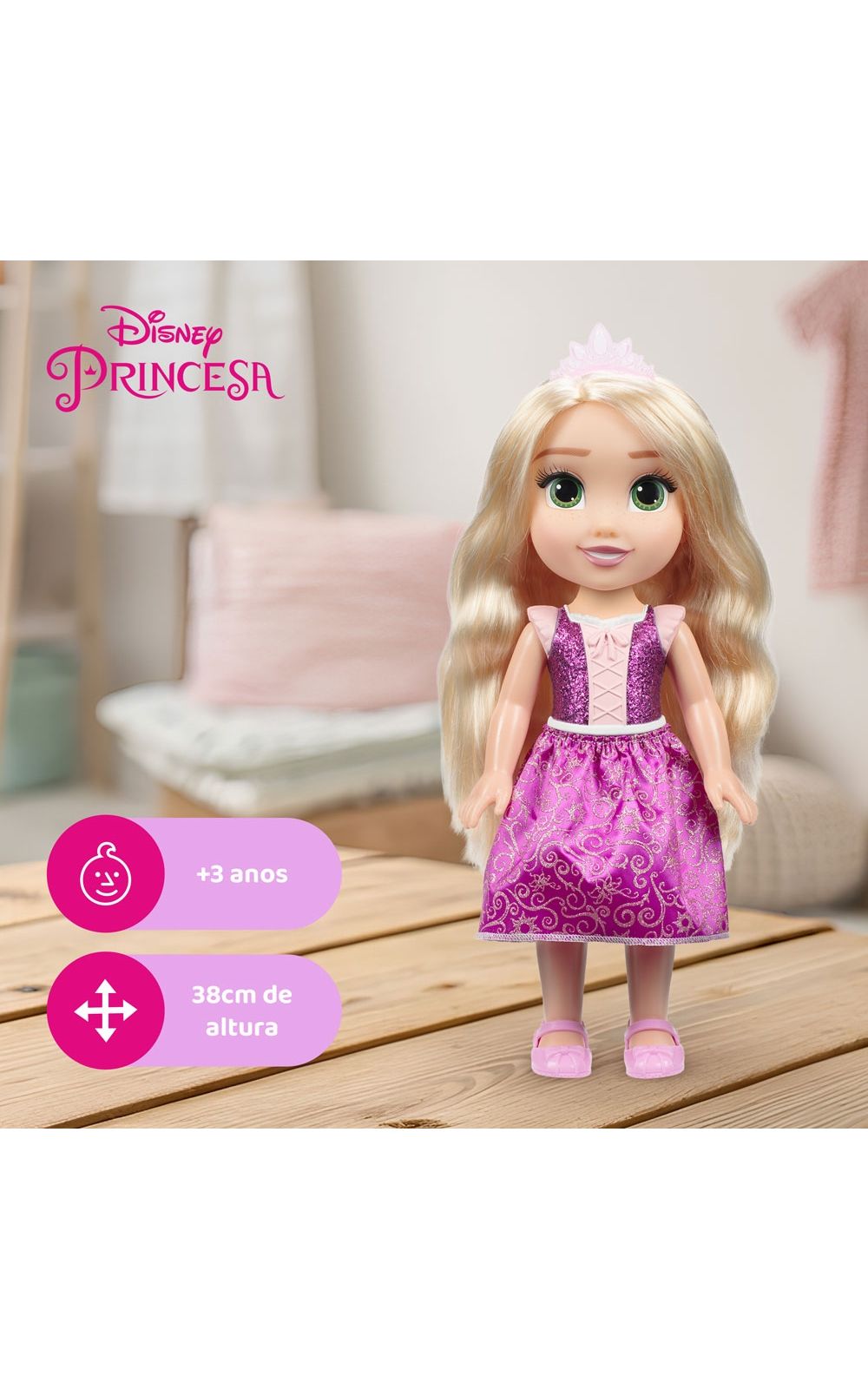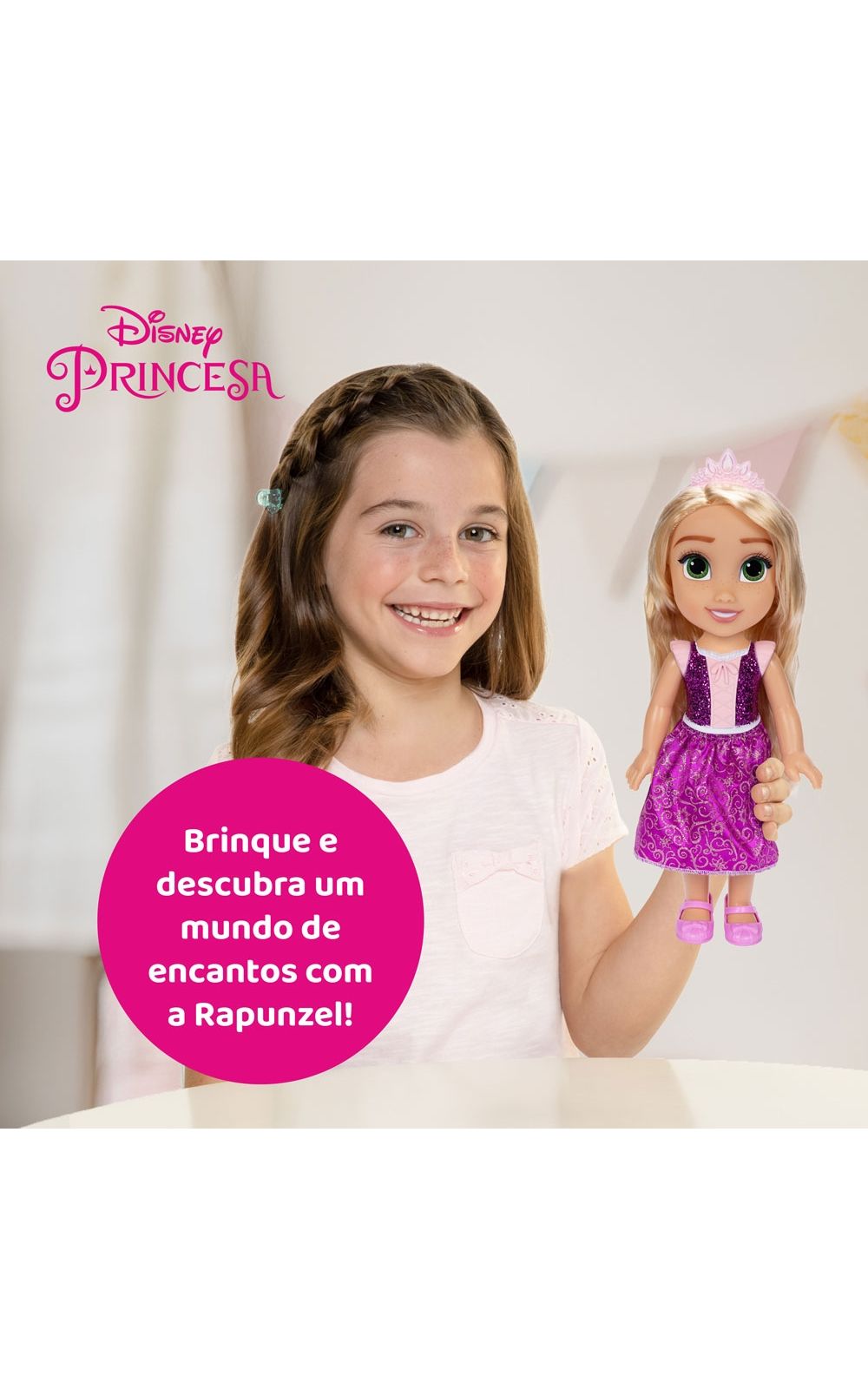 Junte-se a uma jornada mágica de aventuras e sonhos com a belíssima Boneca Disney Princesa Rapunzel!