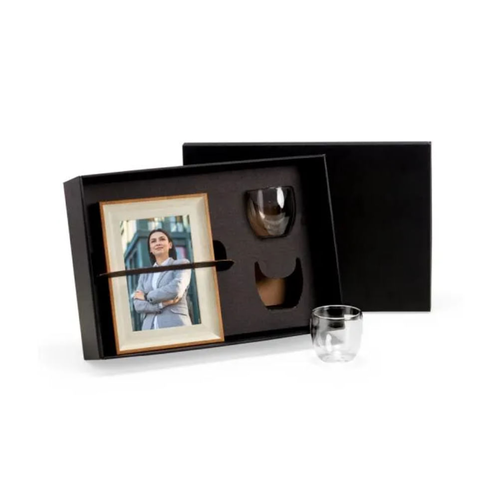 O KIT PORTA RETRATO E COPOS Welf é a escolha perfeita para quem busca combinar funcionalidade e estilo na decoração. Este conjunto exclusivo permite que você eternize momentos especiais enquanto desfruta de suas bebidas favoritas com elegância.