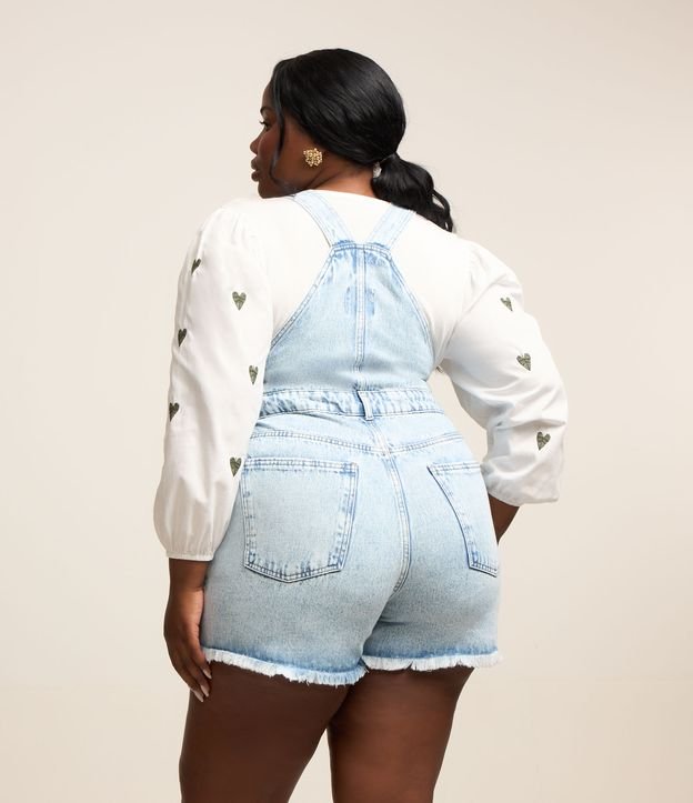 Macacão jeans, estilo jardineira. Peça curta com barra desfiada, bolsos faca laterais, botões frontais e alças ajustáveis.