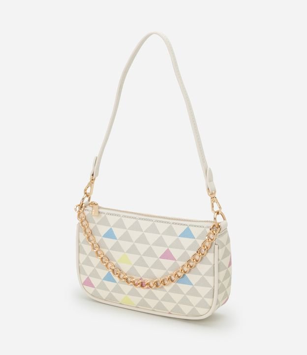 Bolsa feminina confeccionada em material sintética, modelo baguete pequena com zíper, alça de mão, alça longa removível, com detalhes de corrente e estampa triangular.