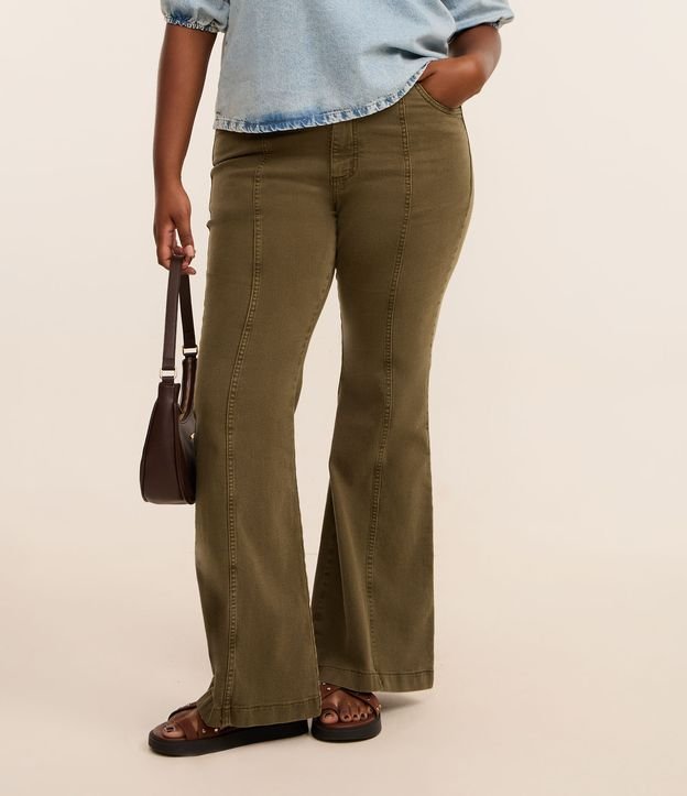 Calça feminina Curve & Plus Size confeccionada em Sarja com elastano em algodão mais sustentável de boas práticas ambientais, peça no modelo flare com cós largo, duplo botões, fechamento tradicional, passantes, detalhe de recortes e bolso.