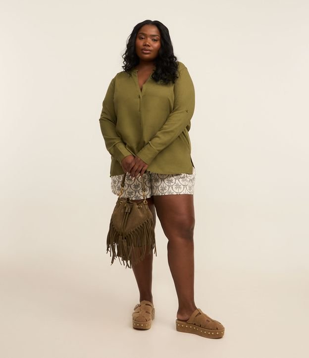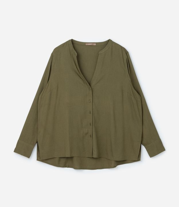 Camisa feminina Curve & Plus Size confeccionada em linho e viscose certificado, peça com gola padre, abotoamento frontal e manga longa.