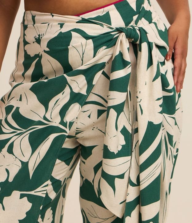 Calça ampla confeccionada em viscolinho estampado de folhagens bicolores. A peça tem amarração tipo pareô, viés contrastante no cós e zíper nas costas.