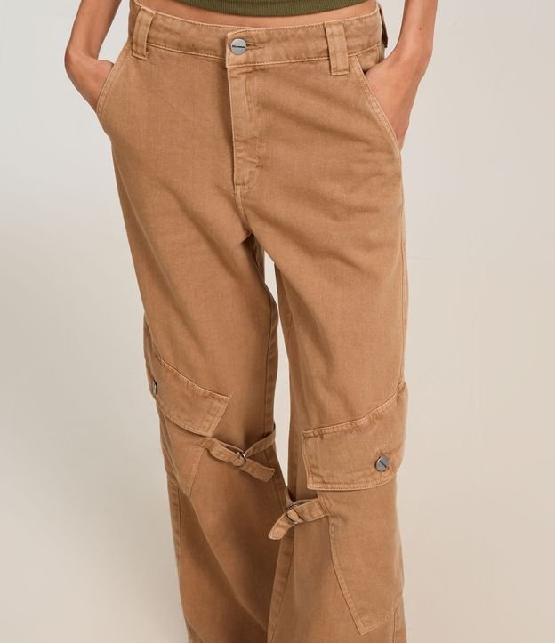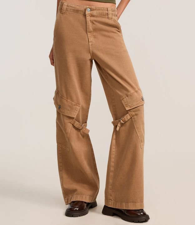 Calça feminina confeccionada em jeans mais sustentável em boas práticas ambientais. Peça no modelo flare com cós passante, fechamento tradicional, em seu diferencial bolsos cargo assimétricos e detalhes de aletas.