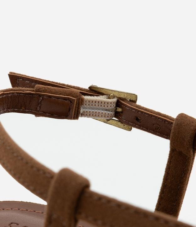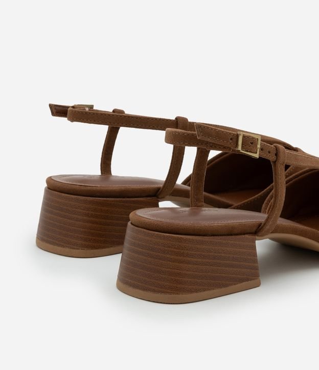 Sapato feminino no modelo Scarpin com bico fino, alça fina em v com fechamento lateral de fivela pequena, salto médio em bloco com fachete.