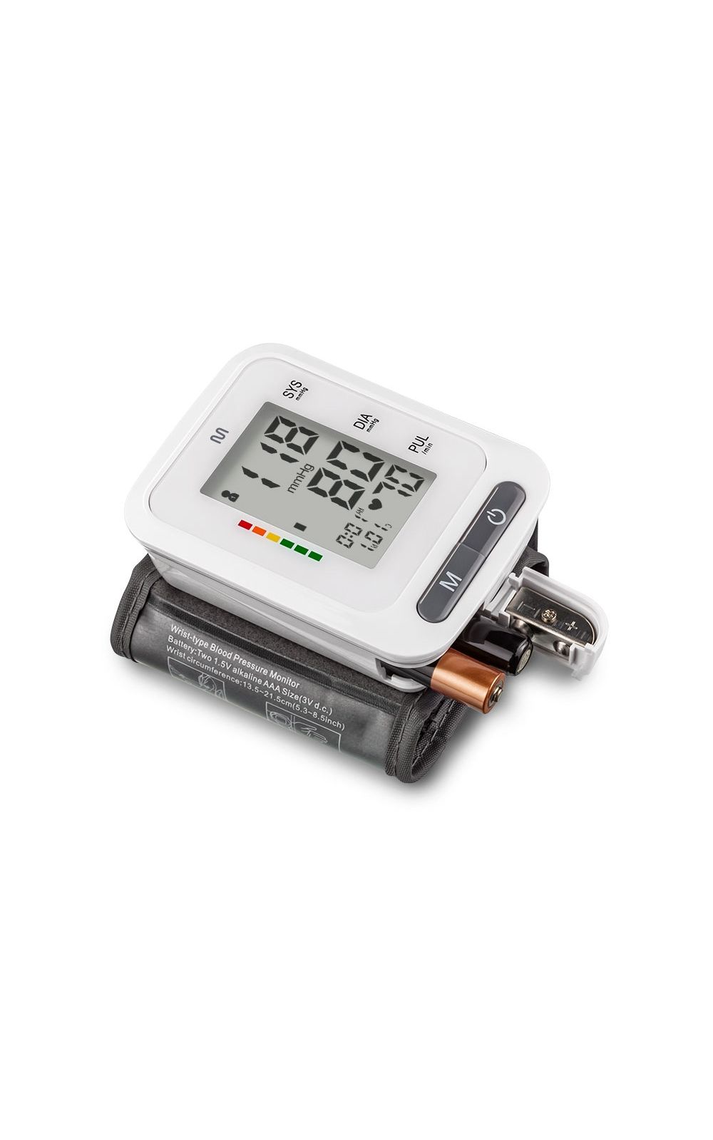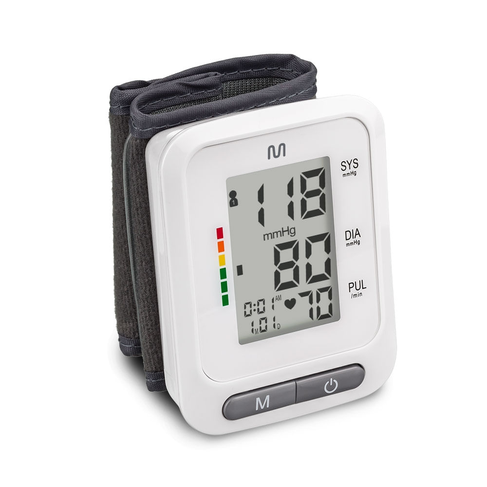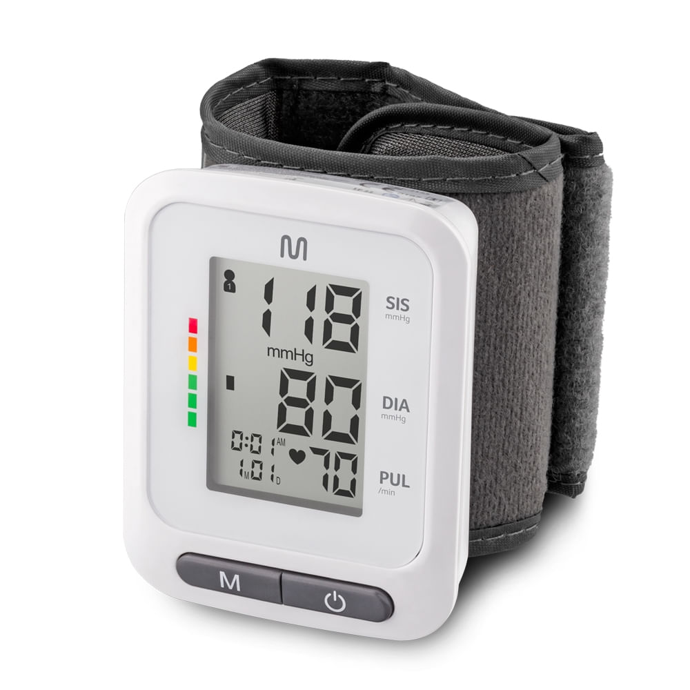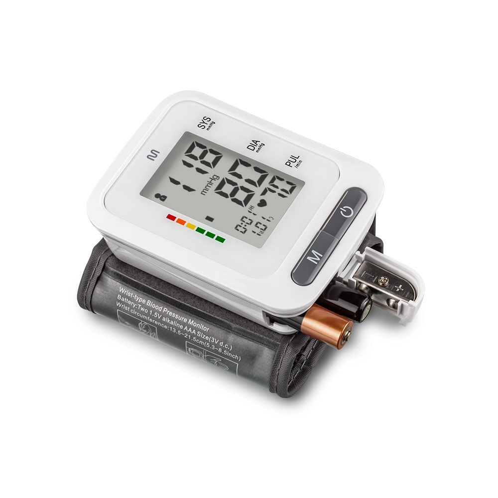 Monitor de pressão digital de pulso, não invasivo e alimentado por pilhas AAA. Ideal para medir a pressão arterial e os batimentos cardíacos de forma rápida e precisa, exibindo os resultados diretamente na tela do aparelho. Possui design compacto, leve e fácil de usar, perfeito para o monitoramento da saúde em casa ou durante viagens. O monitor calcula e exibe a média das três últimas medições