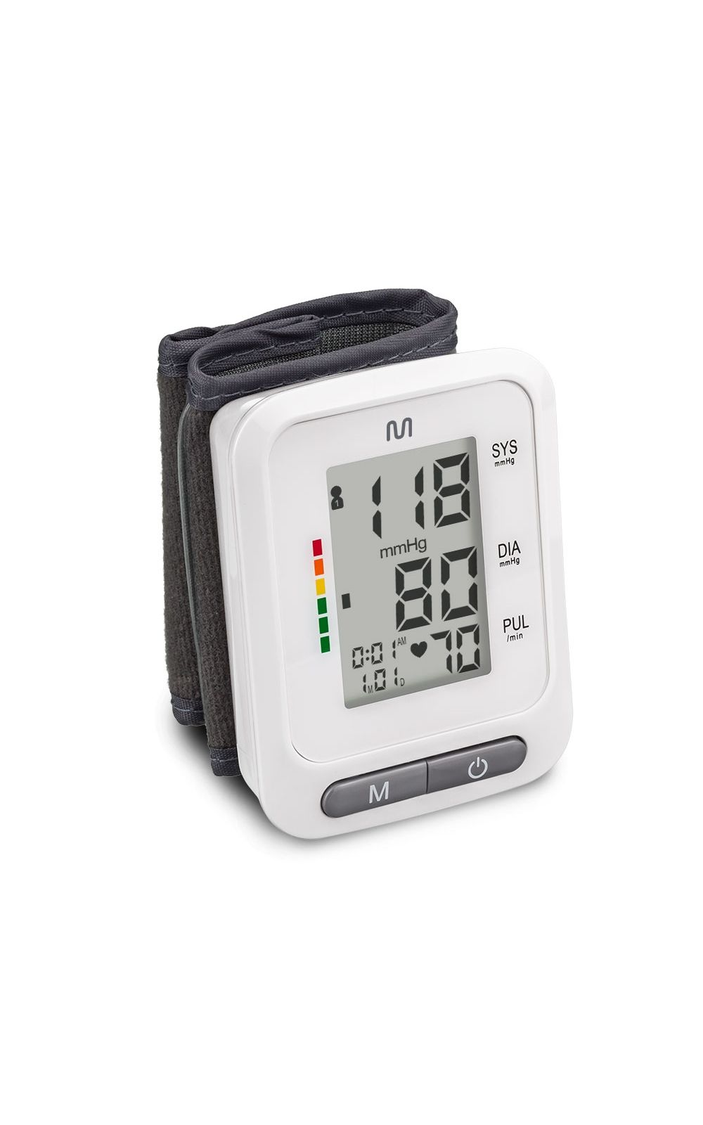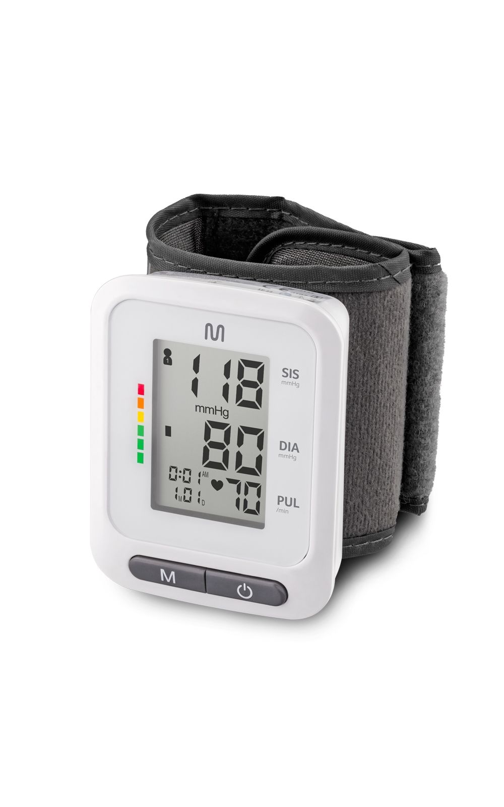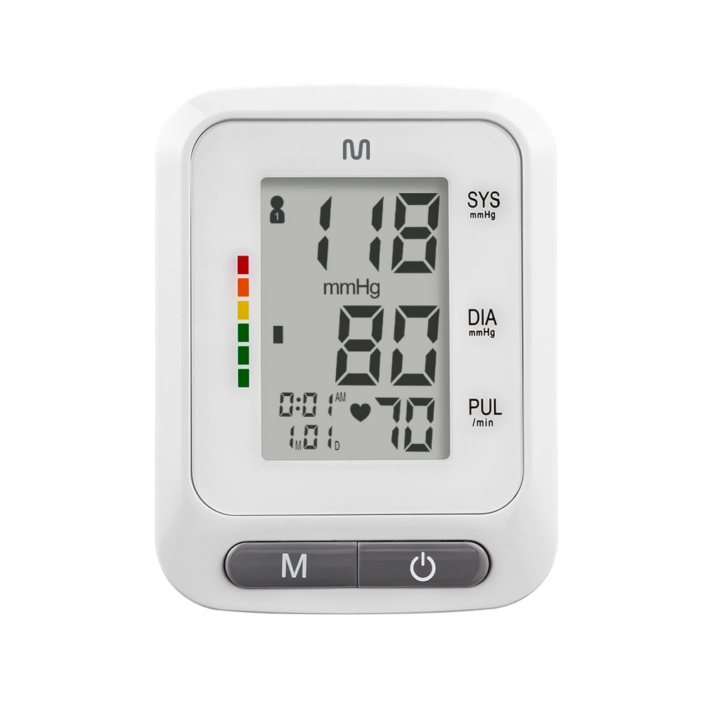 Monitor de pressão digital de pulso, não invasivo e alimentado por pilhas AAA. Ideal para medir a pressão arterial e os batimentos cardíacos de forma rápida e precisa, exibindo os resultados diretamente na tela do aparelho. Possui design compacto, leve e fácil de usar, perfeito para o monitoramento da saúde em casa ou durante viagens. O monitor calcula e exibe a média das três últimas medições