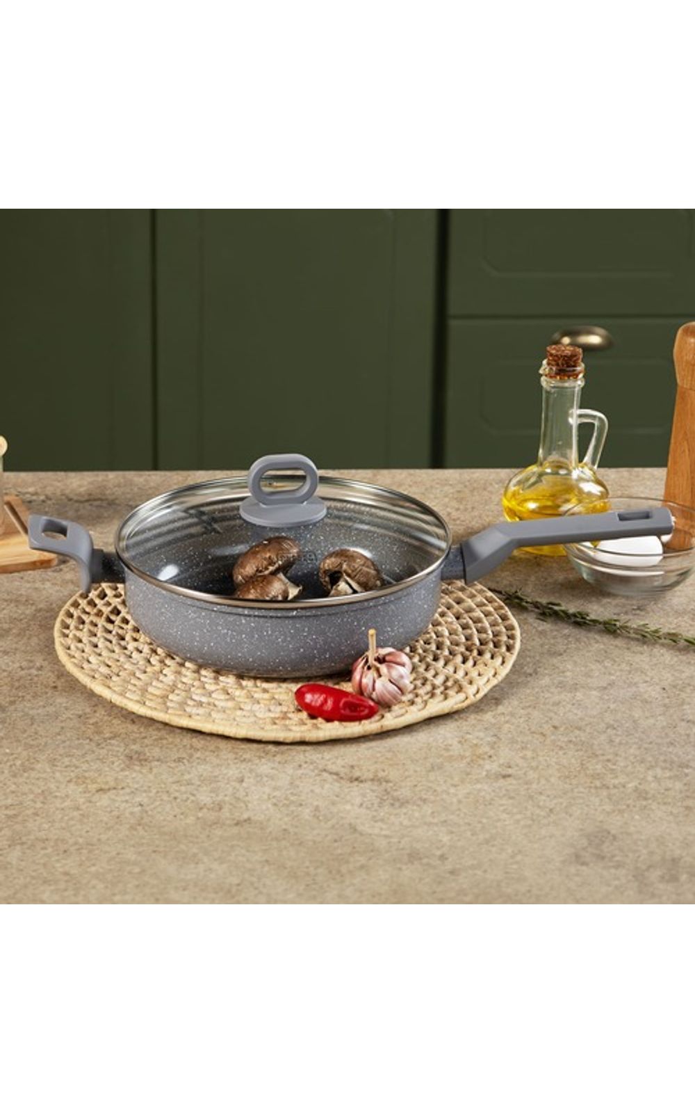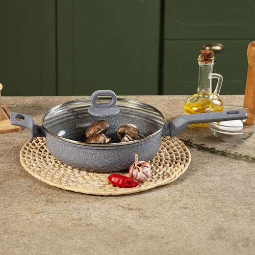 A Frigideira BLACK+DECKER Ceramic Line Grey Marble de 24 cm e 2,7 litros é ideal para uma culinária eficiente e saudável, resolvendo a necessidade de preparos rápidos e com menos óleo. Seu revestimento cerâmico