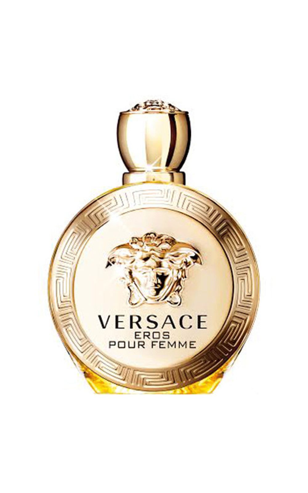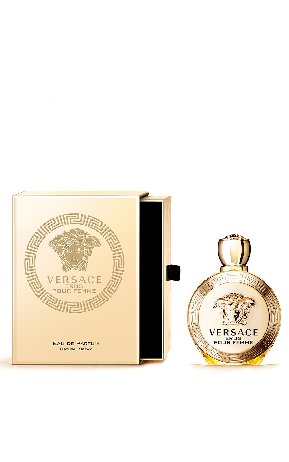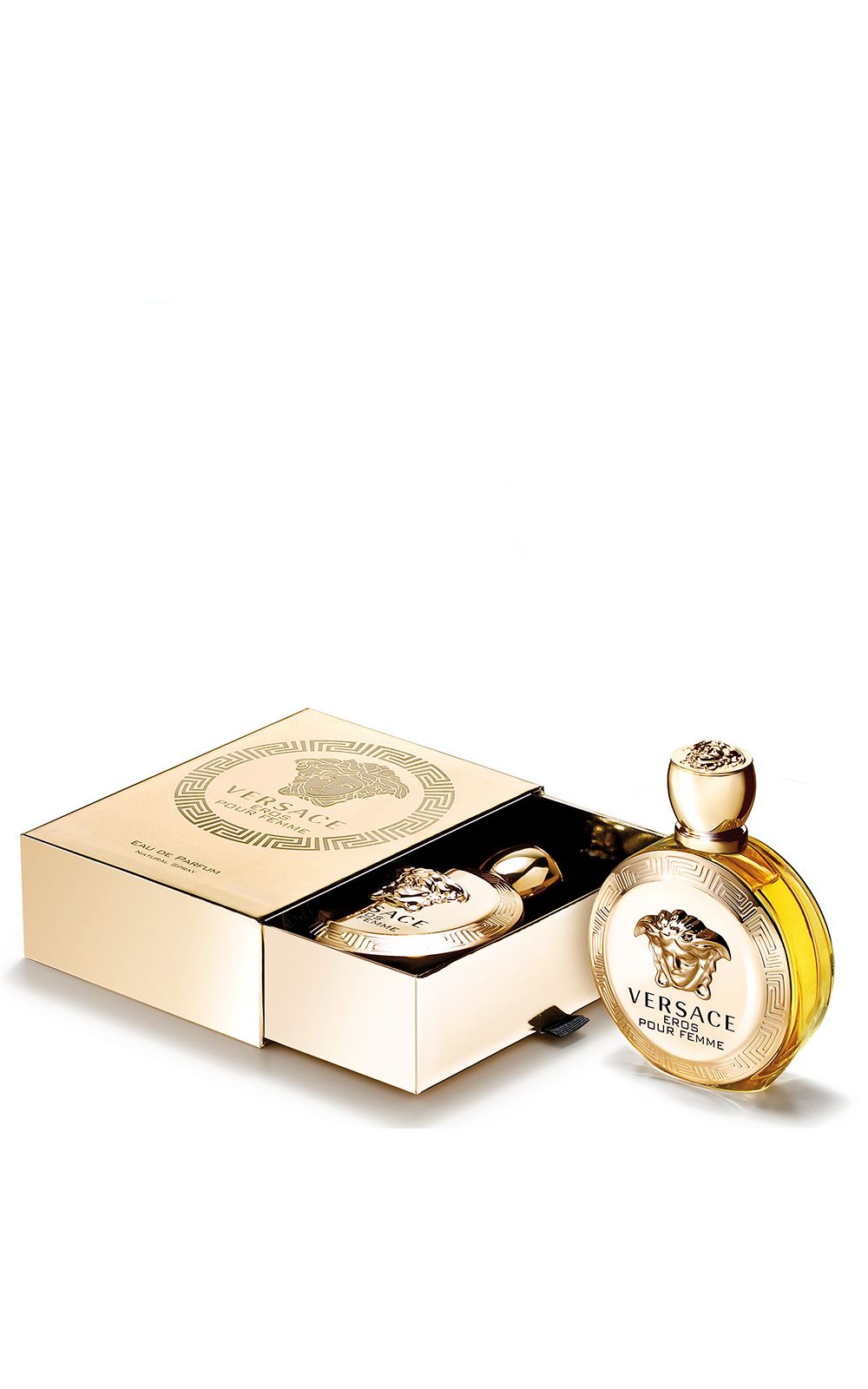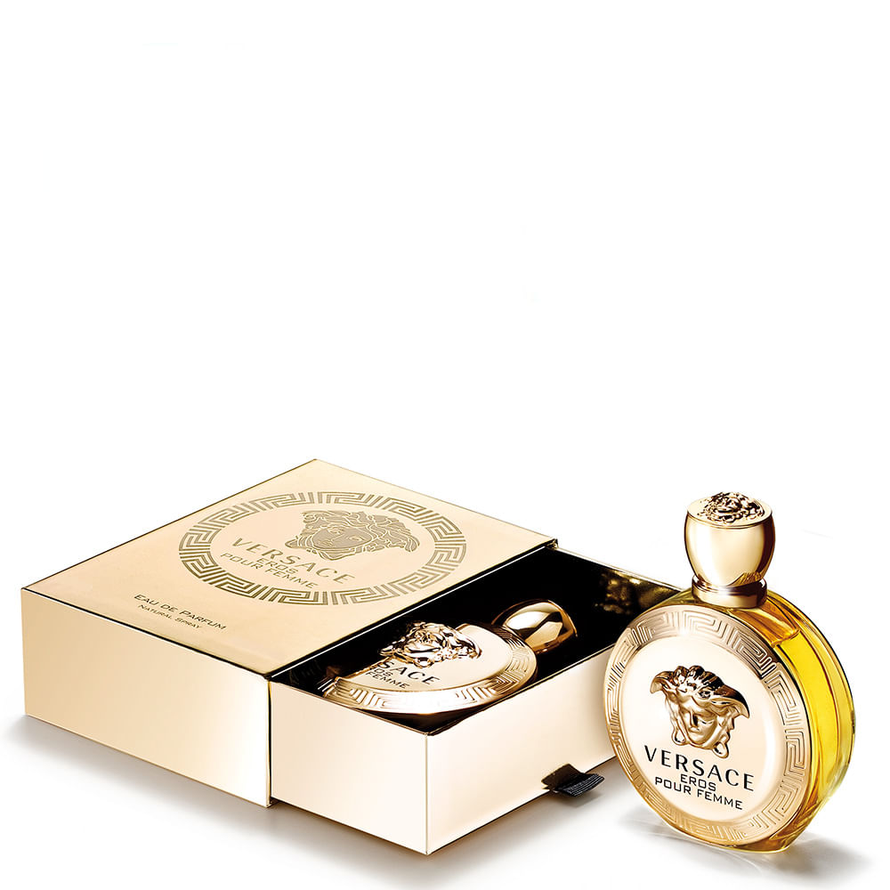 Carrega consigo todos os códigos mitológicos do DNA de Versace. A medusa dourada e as gregas gravadas na sua borda, impõe autoridade, as gregas se repetem na parte posterior do frasco, com a Medusa em alto relevo novamente na parte superior da tampa. Versace Eros pour Femme vem um luxuoso estojo, com uma abertura refinada, típica de elegantes joalherias.