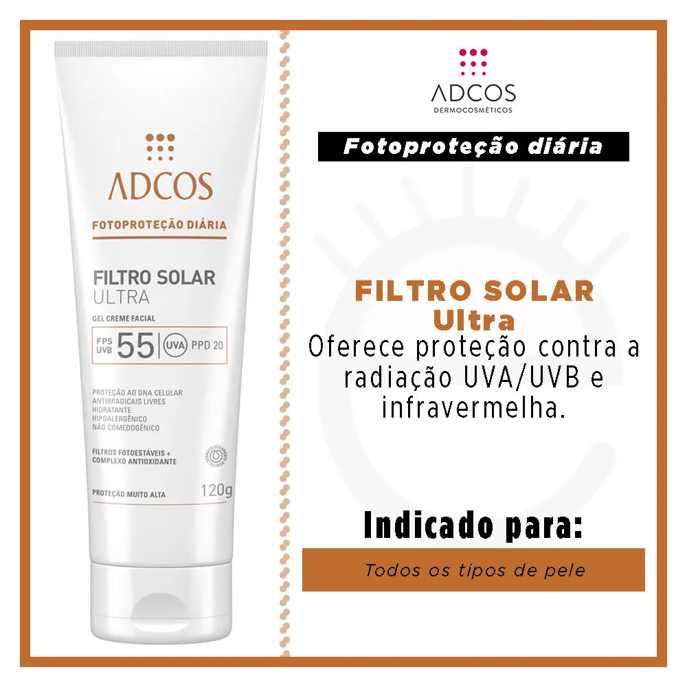 Com alto fator de proteção contra os raios UVA, UVB e Infravermelho, o Filtro Solar Ultra FPS 55 Adcos é um protetor solar em gel creme que trata enquanto protege a pele. Sua fórmula proporciona ação hidratante, que melhora a aparência geral da pele, deixando-a mais luminosa e radiante. O dermocosmético ainda tem ação anti-idade e auxilia no combate aos radicais livres e ao fotoenvelhecimento, deixando a pele mais saudável, e oferece ainda ação calmante e anti-inflamatória, além de proteger o DNA celular. O filtro solar possui textura fina, hidratante, tem ótima espalhabilidade e rápida secagem, além de não ser oleoso (produto oil-free) e nem comedogênico.