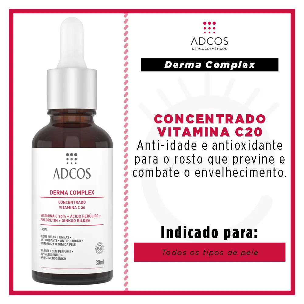 O Derma Complex Concentrado Vitamina C 20 é um anti-idade que uniformiza o tom, revela a luminosidade da pele e estimula a produção de colágeno. É um antioxidante concentrado com 20% de Vitamina C para o rosto, que reduz rugas e firma a pele.