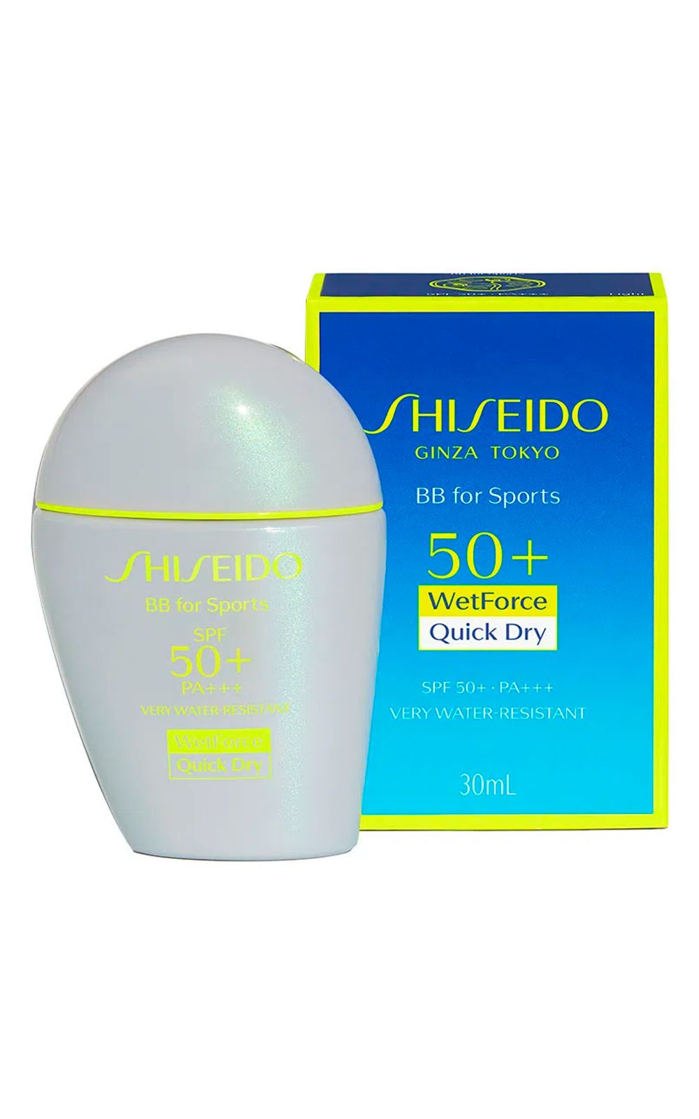 Tecnologia WetForce: Desenvolvida pela Shiseido, a fórmula WetForce tem um íon sensor mineral de carga negativa (ânion). Quando este entra em contato com água, que tem íons de carga positiva (cátions), acabam se juntando. Essa ligação aos minerais na água ou na transpiração cria um filme poderoso que defende a pele dos raios UV - ou seja, quanto mais você transpira, mais forte é a proteção. Com uma fórmula resistente à água e filtro de proteção solar alto, BB for Sports permite um período de 80 minutos submerso embaixo da água.