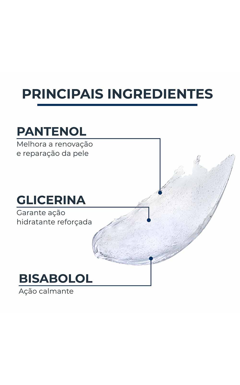 O pantenol, também conhecido como dexpantenol ou provitamina B5, é um derivado da vitamina B5. É muito eficaz em acalmar a pele, pois ajuda a restaurar a barreira natural da pele e dá suporte ao seu processo de renovação. Ele também ajuda a atrair a água e mantê-la na pele, tornando-se um hidratante muito eficiente. A glicerina, também chamada de glicerol, é um umectante, ou seja, ela ajuda a atrair a água, prendendo-a na pele. Isso a torna um hidratante muito eficaz, pois tanto suaviza a pele seca, como confere proteção e cuidados de longa duração. O glicerol é incolor, inodoro e não tóxico. Bisabolol: O Alfa Bisabolol apresenta propriedades anti-inflamatórias, anti-sépticas, bactericidas, antimicóticas e cicatrizantes.