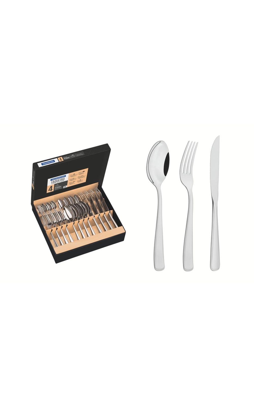 Para apreciar um bom churrasco não pode faltar o Faqueiro Tramontina em Aço Inox com Facas para Churrasco Acabamento Alto Brilho com Detalhes no Cabo 24 Peças da linha Pacific. Os talheres são produzidos em aço inox, garantindo sua durabilidade e qualidade. O jogo conta com colheres com bojo em formato simétrico e bordas cuidadosamente arredondadas. Garfos com dentes polidos na parte interna, com formato apropriado para a boca e bordas arredondadas para proporcionar maior conforto no uso. Facas totalmente temperadas, que garantem maior durabilidade no fio de corte serrilhado e maior resistência à corrosão, e por suas características de temperabilidade, não riscam as porcelanas. Oferecendo um serviço para mesa para até 4 pessoas. Para trazer ainda mais beleza para mesa, conta com acabamento em alto brilho e lindos detalhes no cabo.