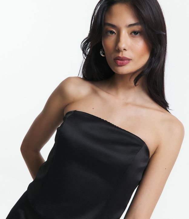 Blusa tomara que caia, acetinada, zíper invisível na lateral e sem estampa.