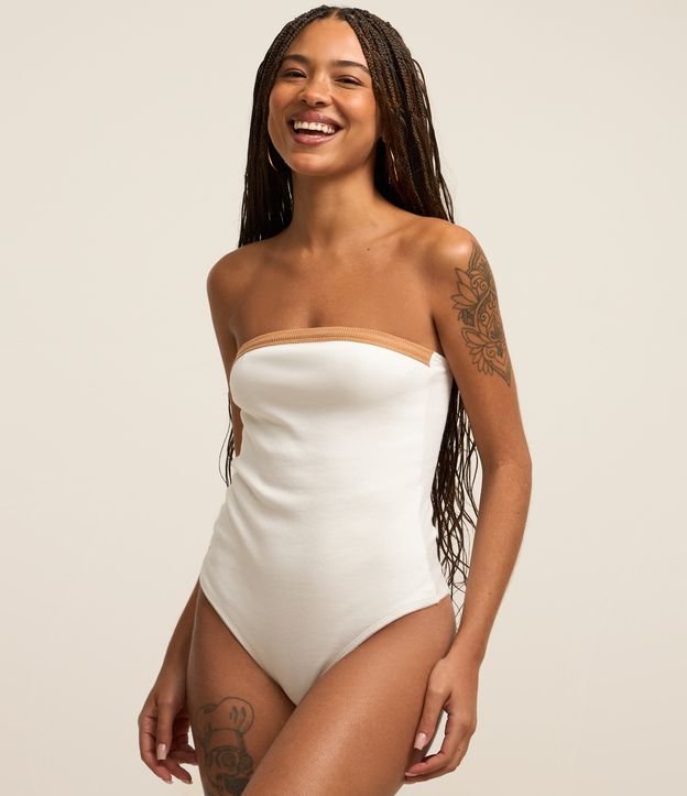 Body tomara que caia confeccionado em ribana com viés contrastante e leve textura.