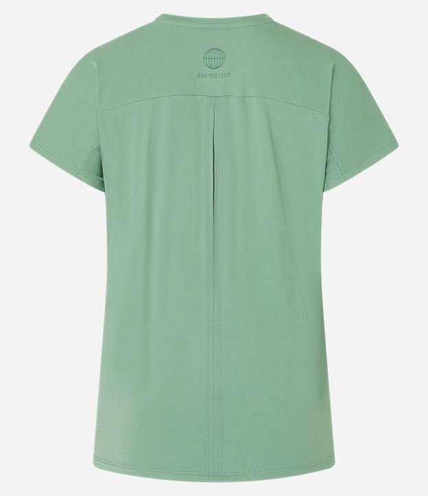 Blusa esportiva confeccionada em microfibra seguindo boas práticas ambientais. A camiseta tem gola redonda, mangas curtas, pala nos ombros e abertura nas costas.