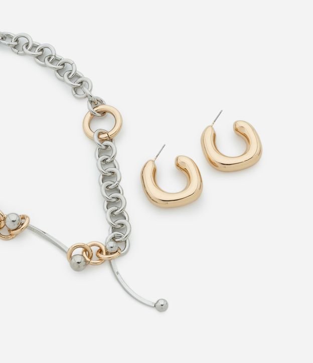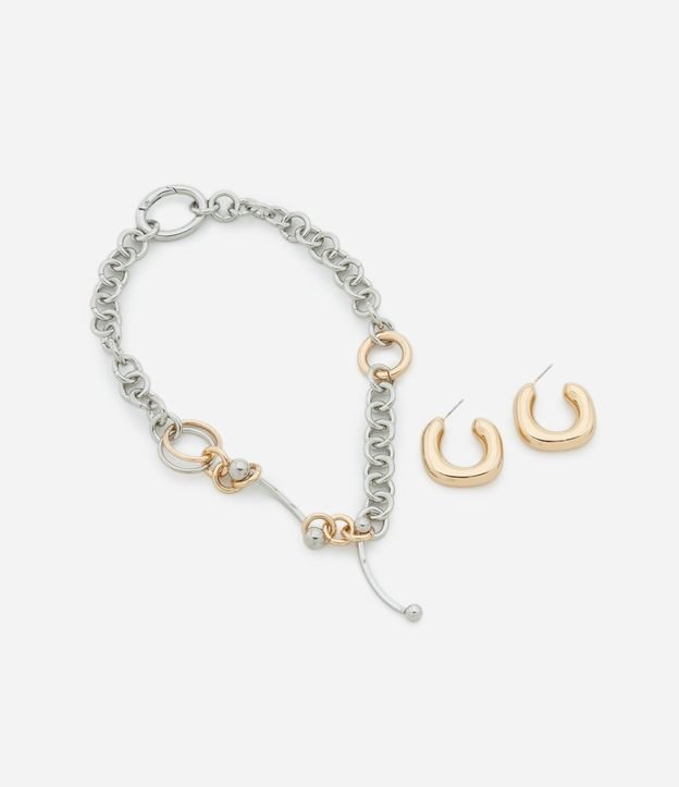 Conjunto de colar curto com corrente de elos e piercings contrastantes acompanhado de par de brincos argola bold.