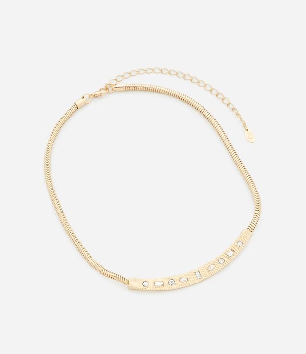 Colar curto confeccionado em metal reciclado com corrente rabo de rato, fechamento por lagosta, peça com placa de metal com strass de formas diferentes.