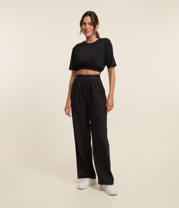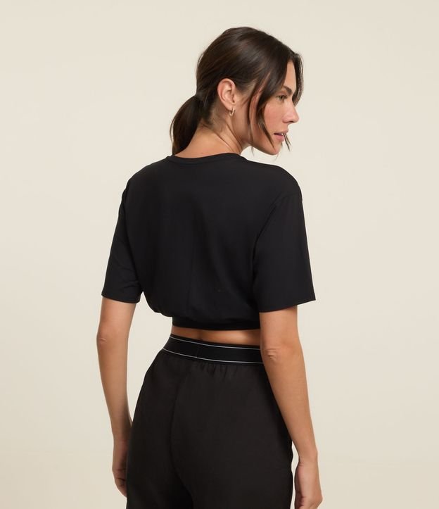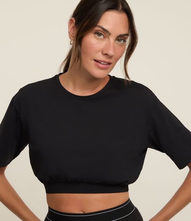Blusa cropped com manga curta, esportiva com franzido frontal e elástico embutido na barra.