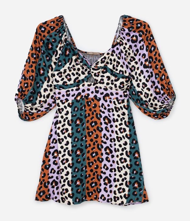 Vestido curto feminino Curve & Plus Size confeccionado com Viscose mais sustentável com boas práticas ambientais, decote quadrado com transpasse, detalhe de recorte, manga curta ajustada com elástico na barra e estampa animal print com contraste de cores.