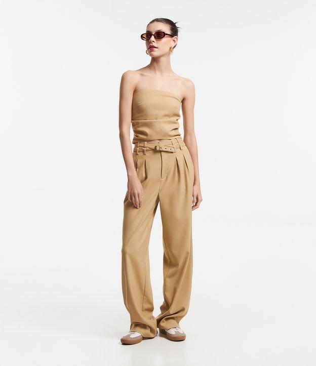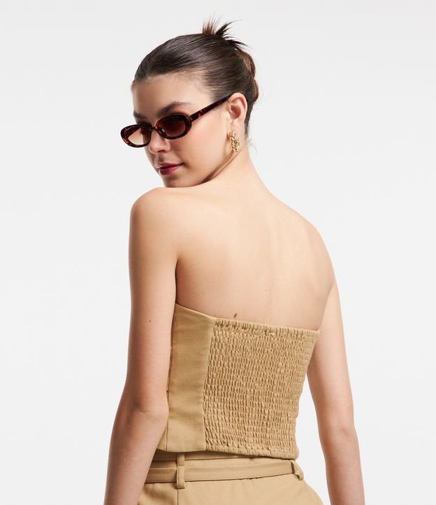 Blusa cropped, em alfaiataria, com decote tomara que caia, e lastex nas costas.