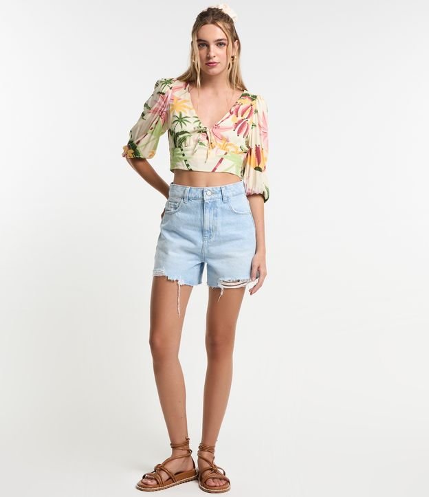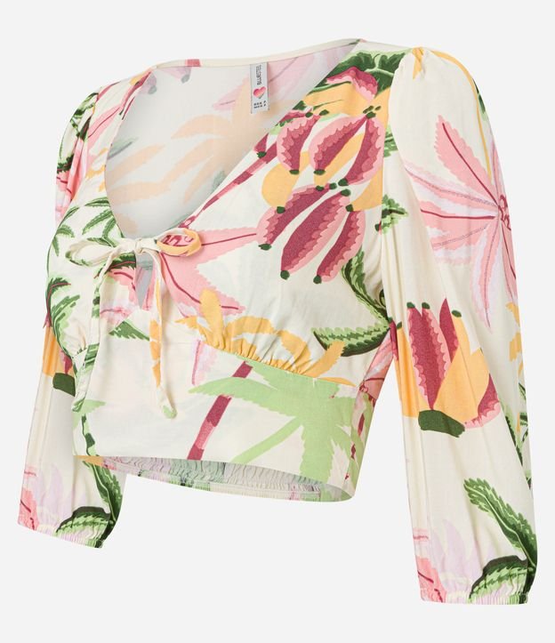 Blusa cropped com mangas 3/4, decote com amarração, elástico nos punhos, lastex nas costas e estampa tropical de folhagens.