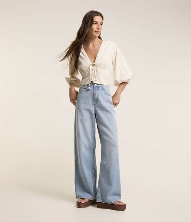 Blusa de mangas 3/4 bufantes em viscolinho com amarração. Possui comprimento mais curto e miçangas aplicadas na amarração.