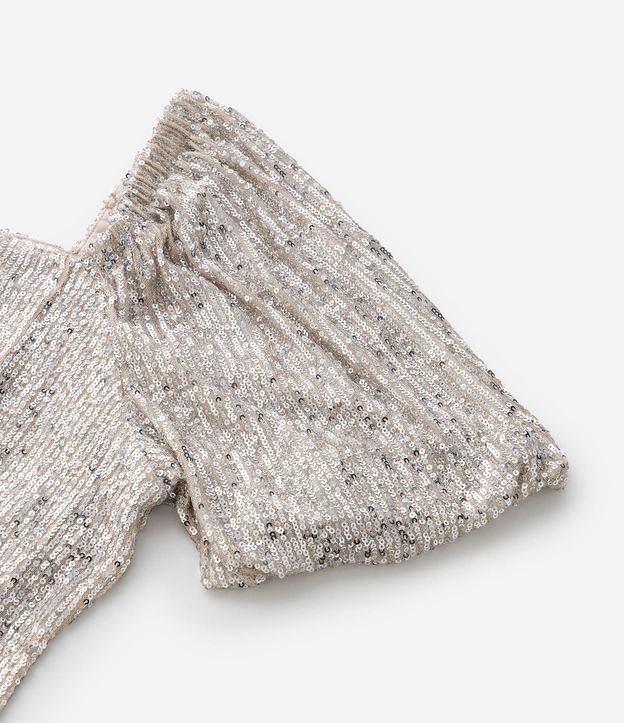 Vestido de paetê com mangas curtas e decote quadrado.