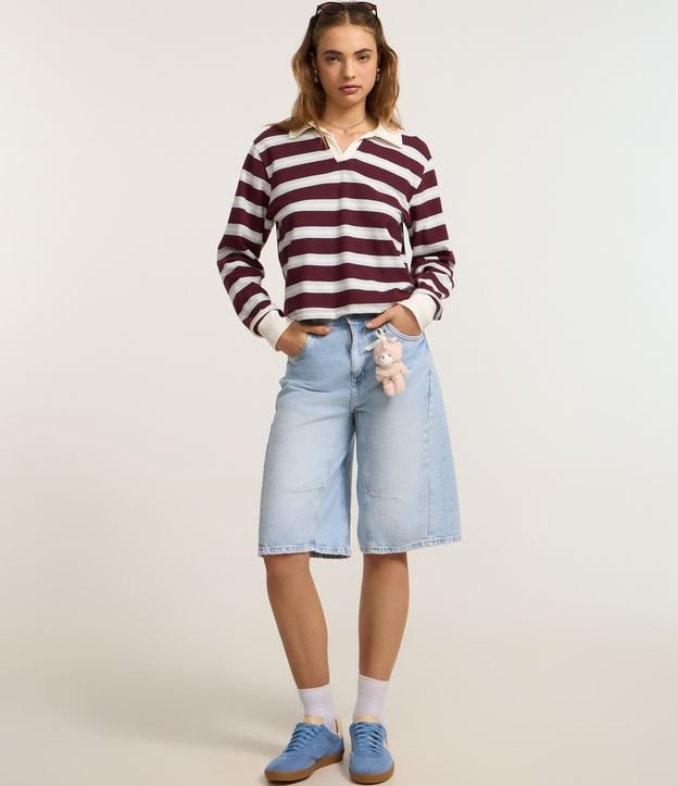 Camiseta confeccionada em malha de algodão mais sustentável. A peça tem gola polo contrastante, mangas longas e estampa de listras horizontais.