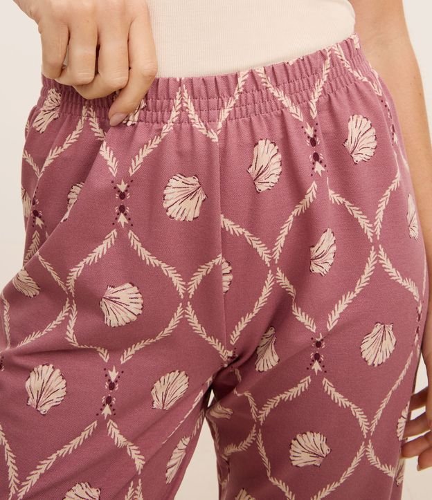 Conjunto de homewear composto por três peças: blusa lisa de alcinha regulável e rendinha no decote; calça capri com cintura elástica e recorte nas barras; e robe com dupla amarração frontal. A calça e o robe têm estampa de conchinhas do mar.