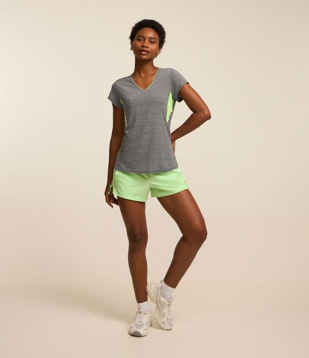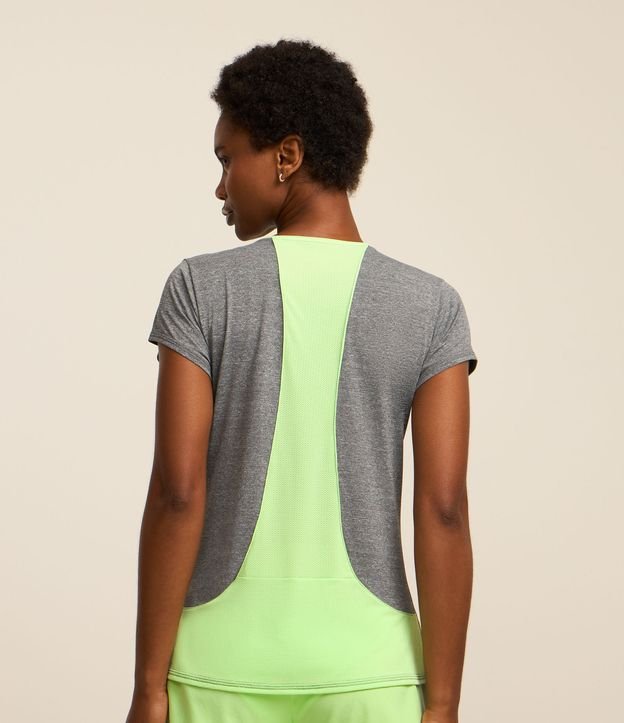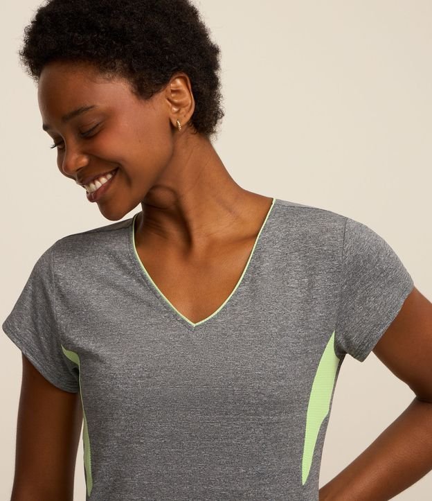 Camiseta feminina esportiva, confeccionada em malha de poliamida, com gola redonda e mangas curtas possui estampa de recortes.