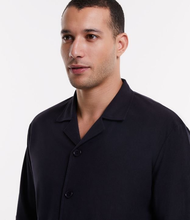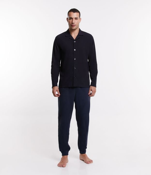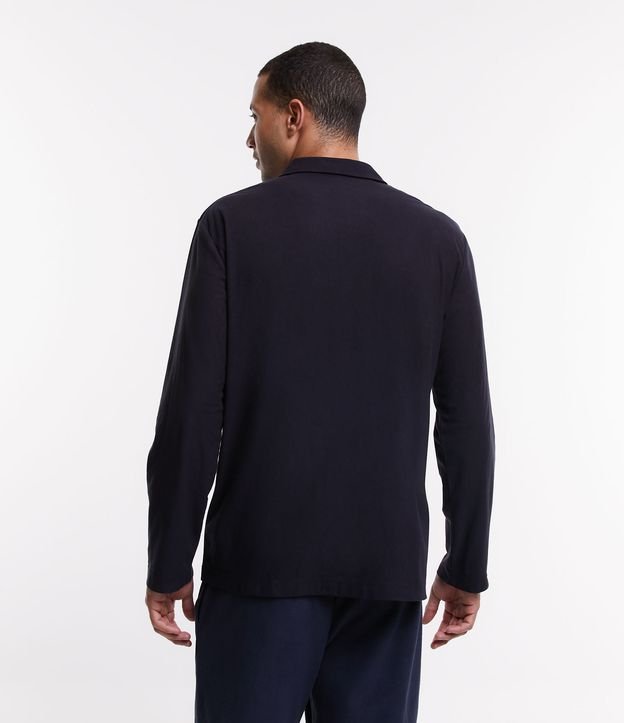 Pijama masculino, modelo camisa em fleece, com gola lapela, abotoamento frontal, mangas longas e superfície sem estampa.