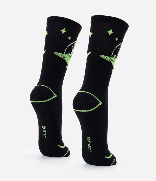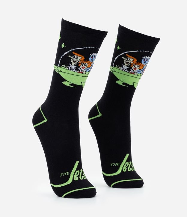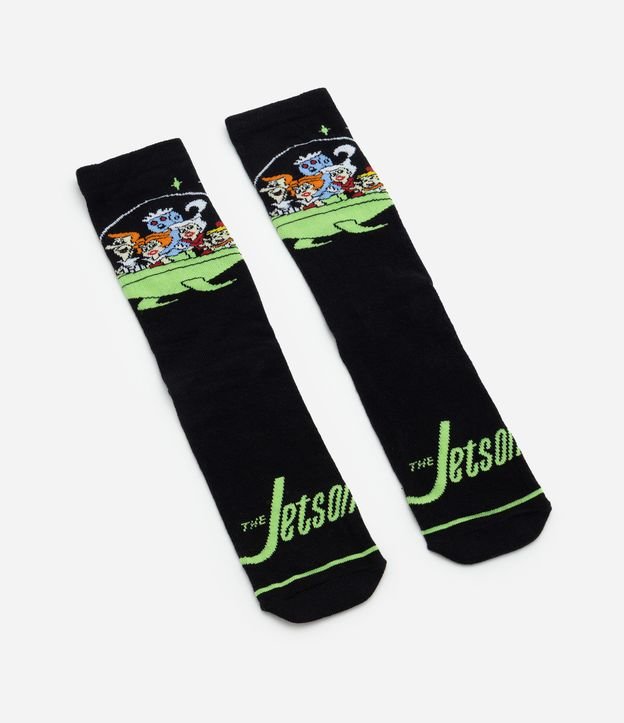 Meia masculina confeccionada em algodão mais sustentável, no modelo cano alto, possui estampa de Os Jetsons.
