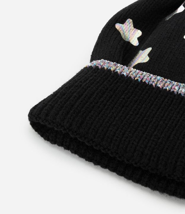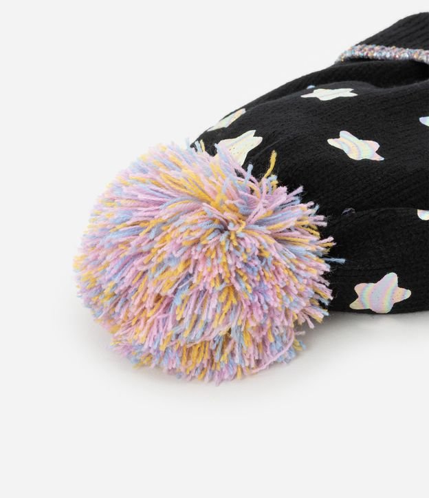 Gorro infantil confeccionado em tricô, com pompom no topo, barra dobrada e estampa de estrelinhas metalizadas.