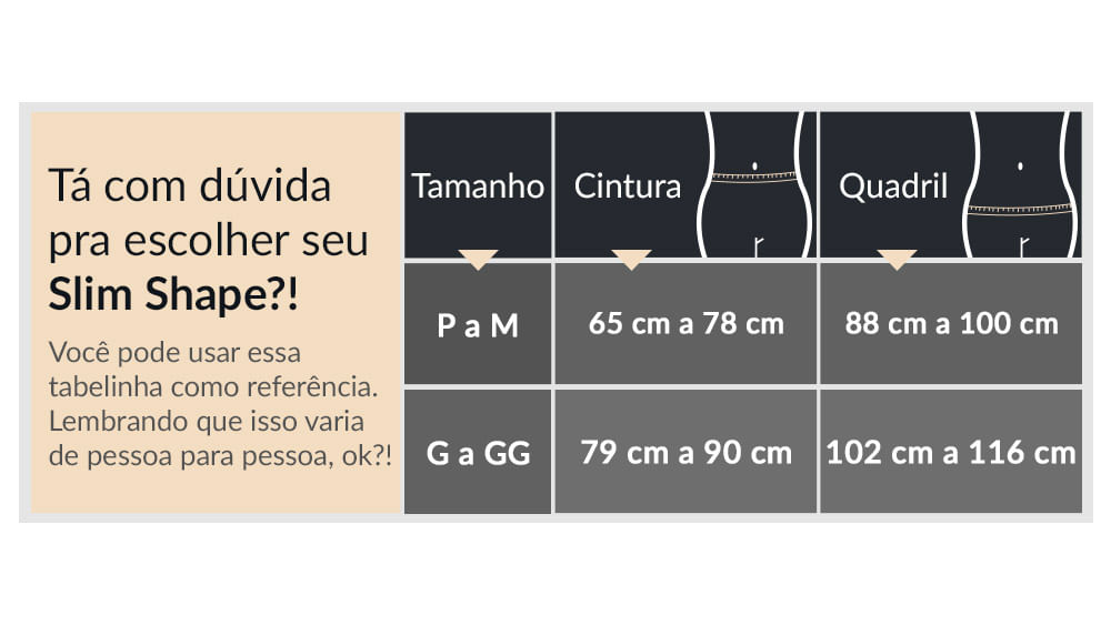Slim Shape está disponível em 2 tamanhos que vestem do P ao M e do G ao GG, ideal para diferentes tipos de corpo!